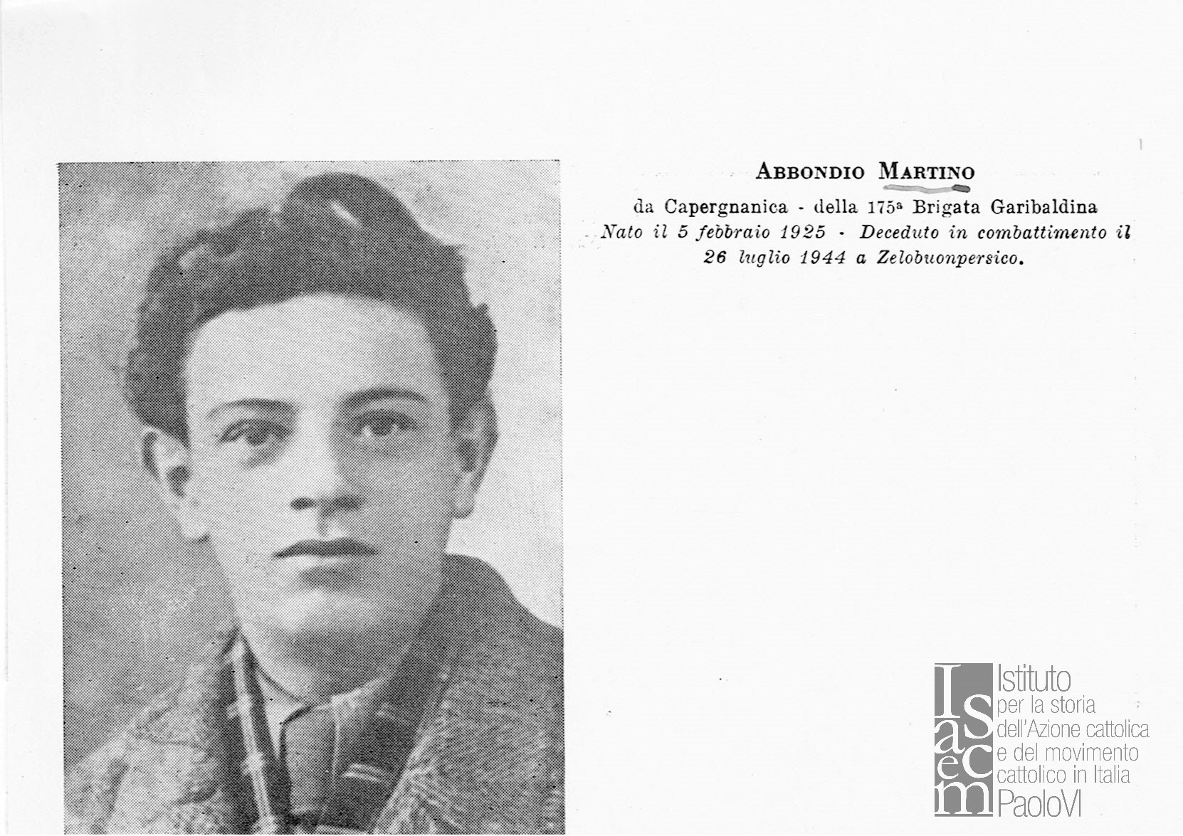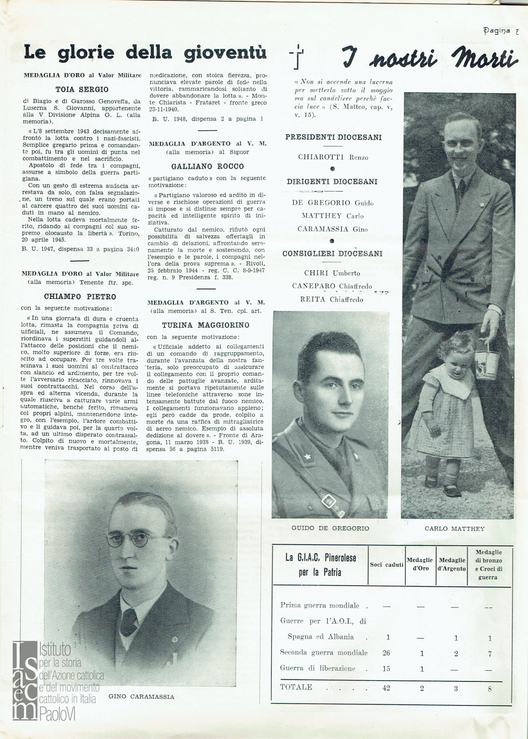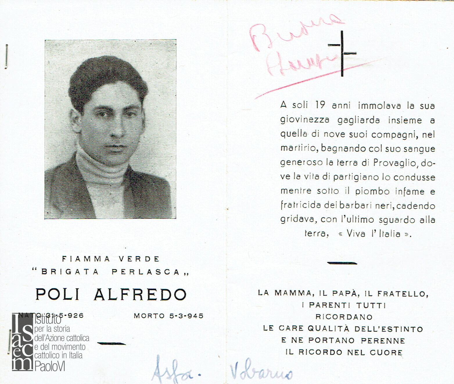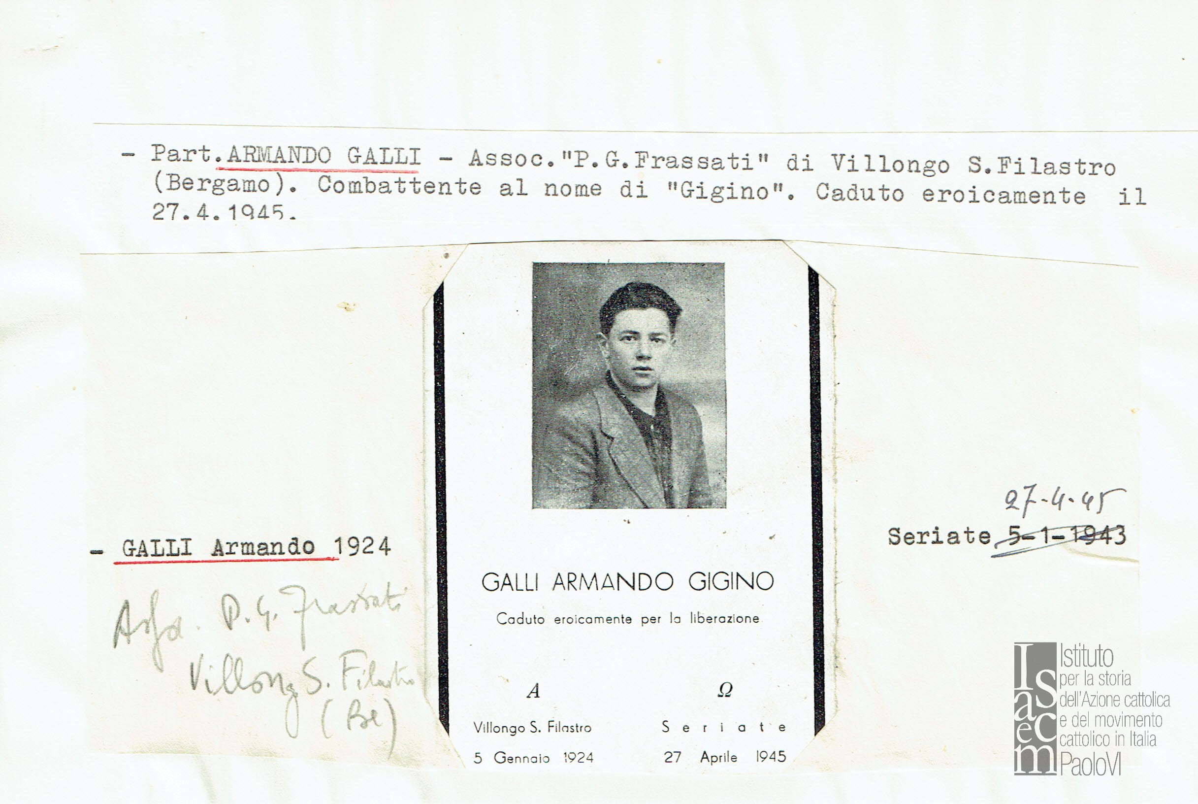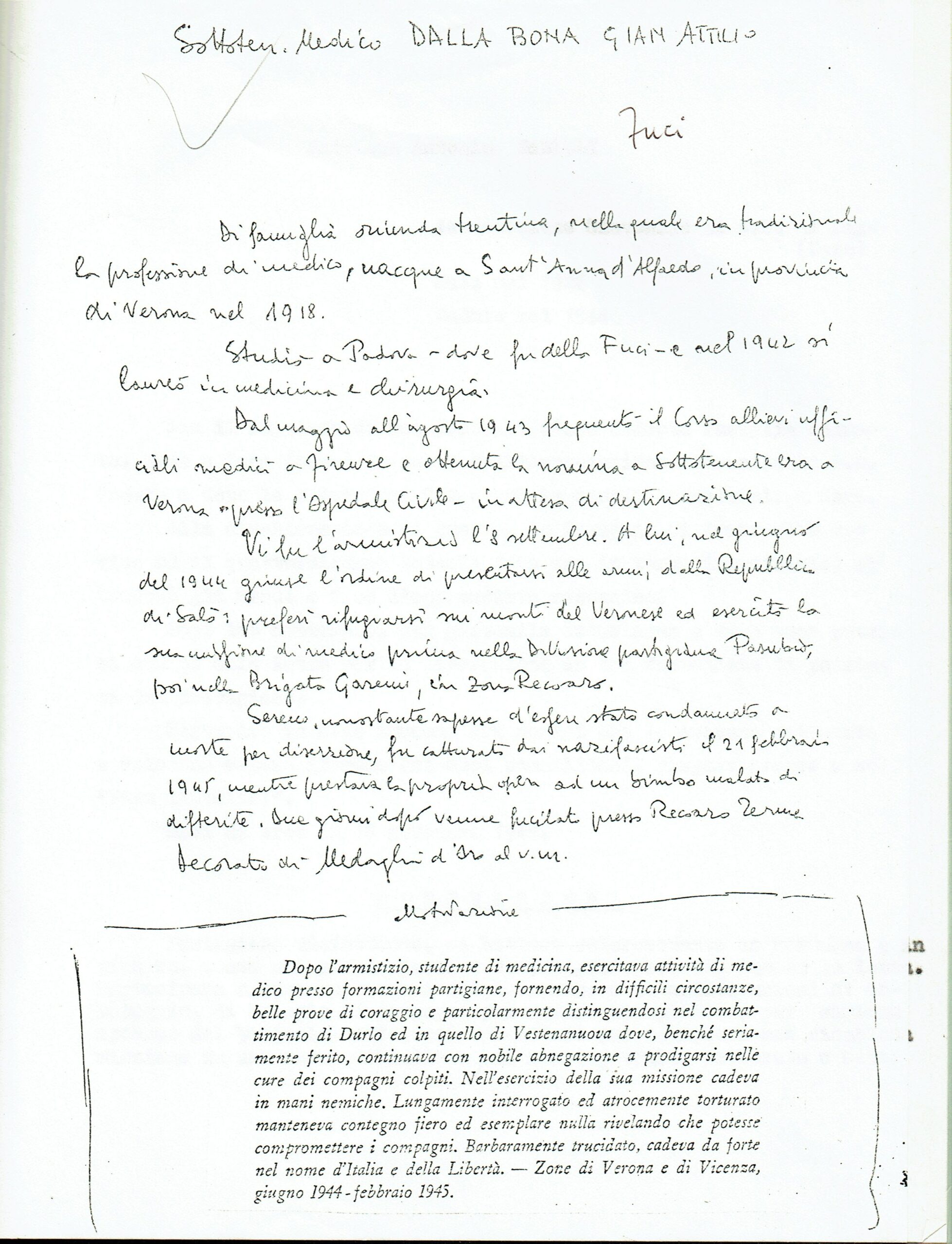 Profilo di Gian Attilio Dalla Bona sull'albo di gloria dei caduti di Azione cattolica nella Resistenza. Isacem, Righini, b. 26, fasc. 4a