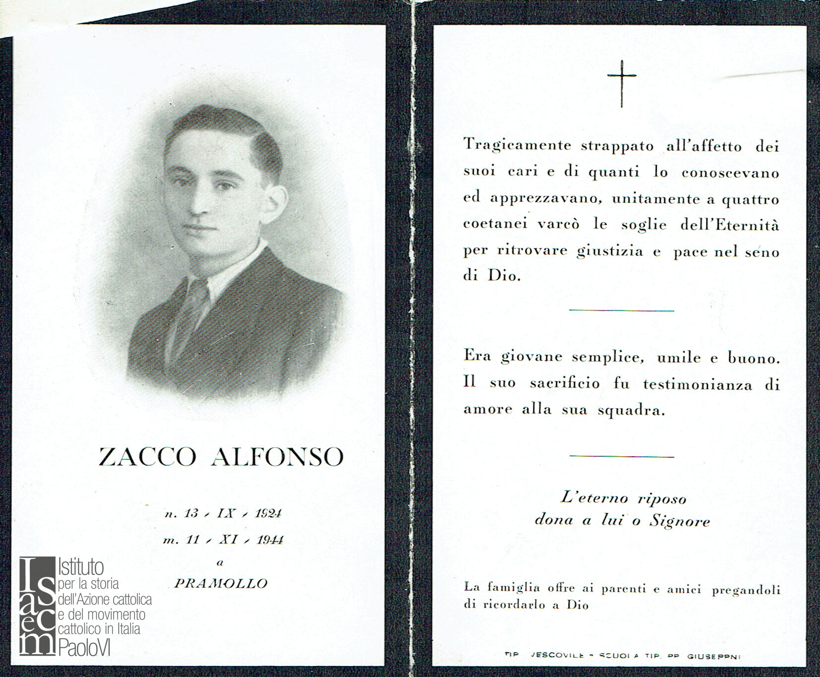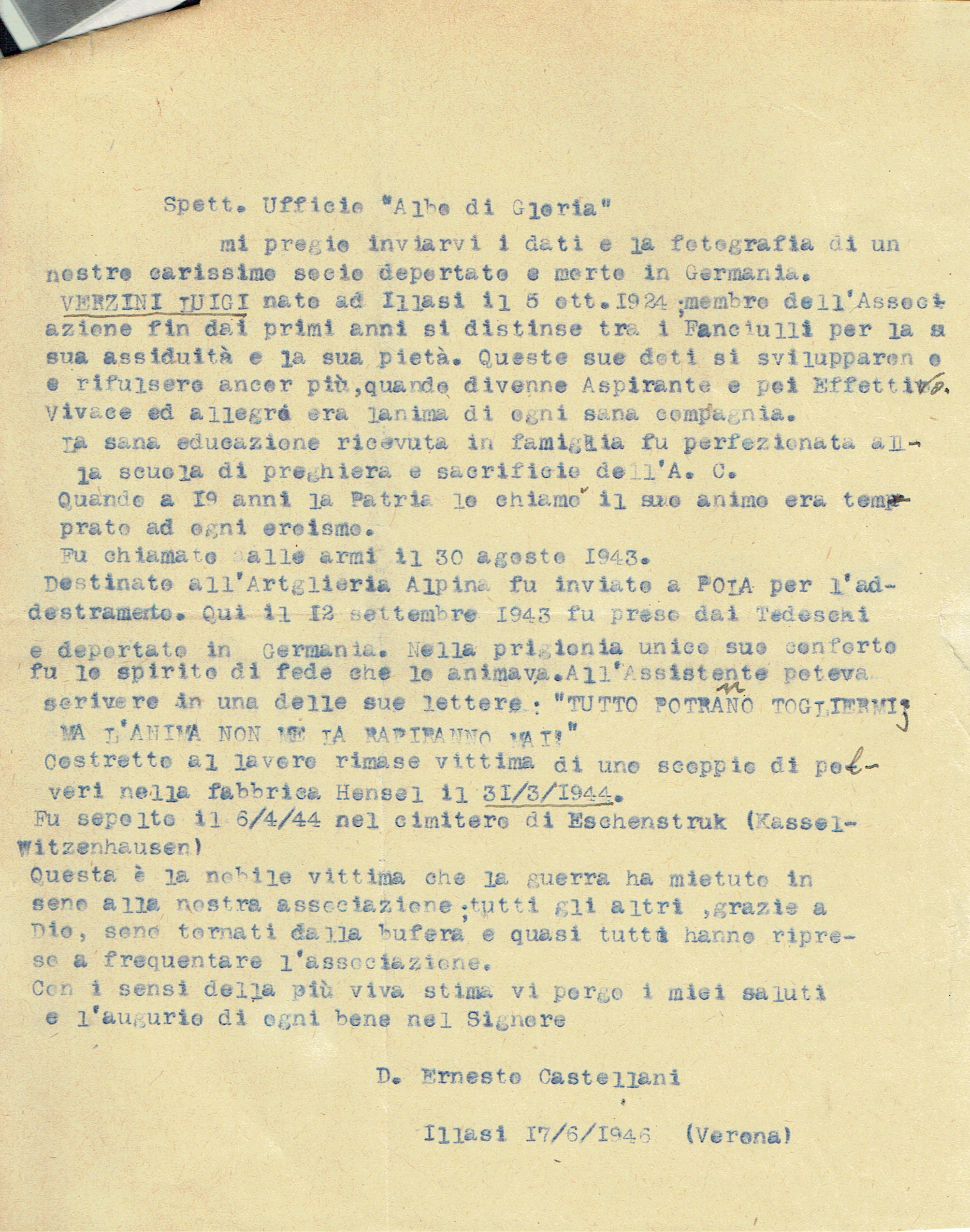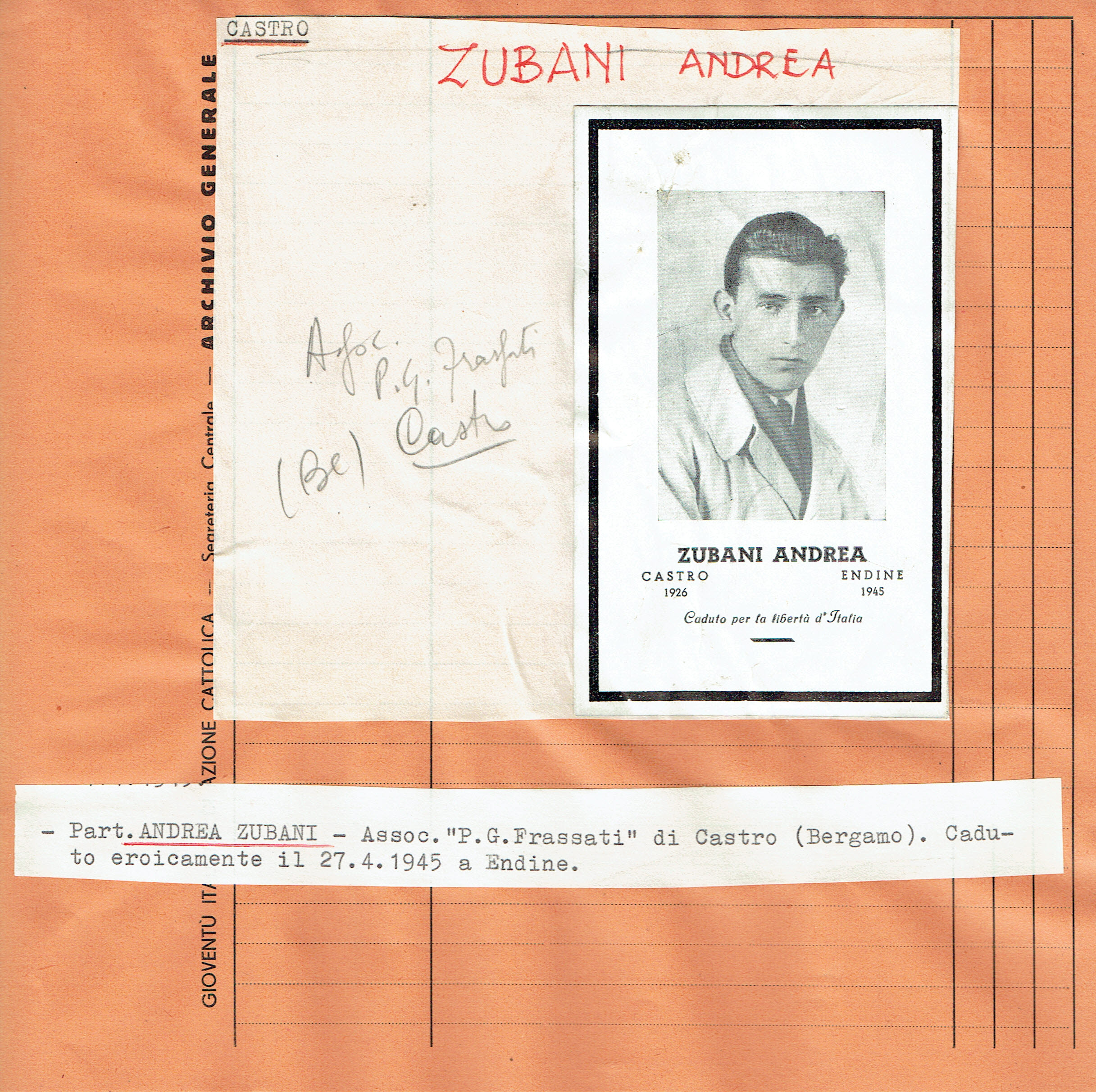 Raccolta informazioni su Andrea Zubani per l'albo di gloria dei caduti dell'Azione cattolica nella Resistenza. Isacem, Giac, b. 776, fasc. Zappa-Zuffetti