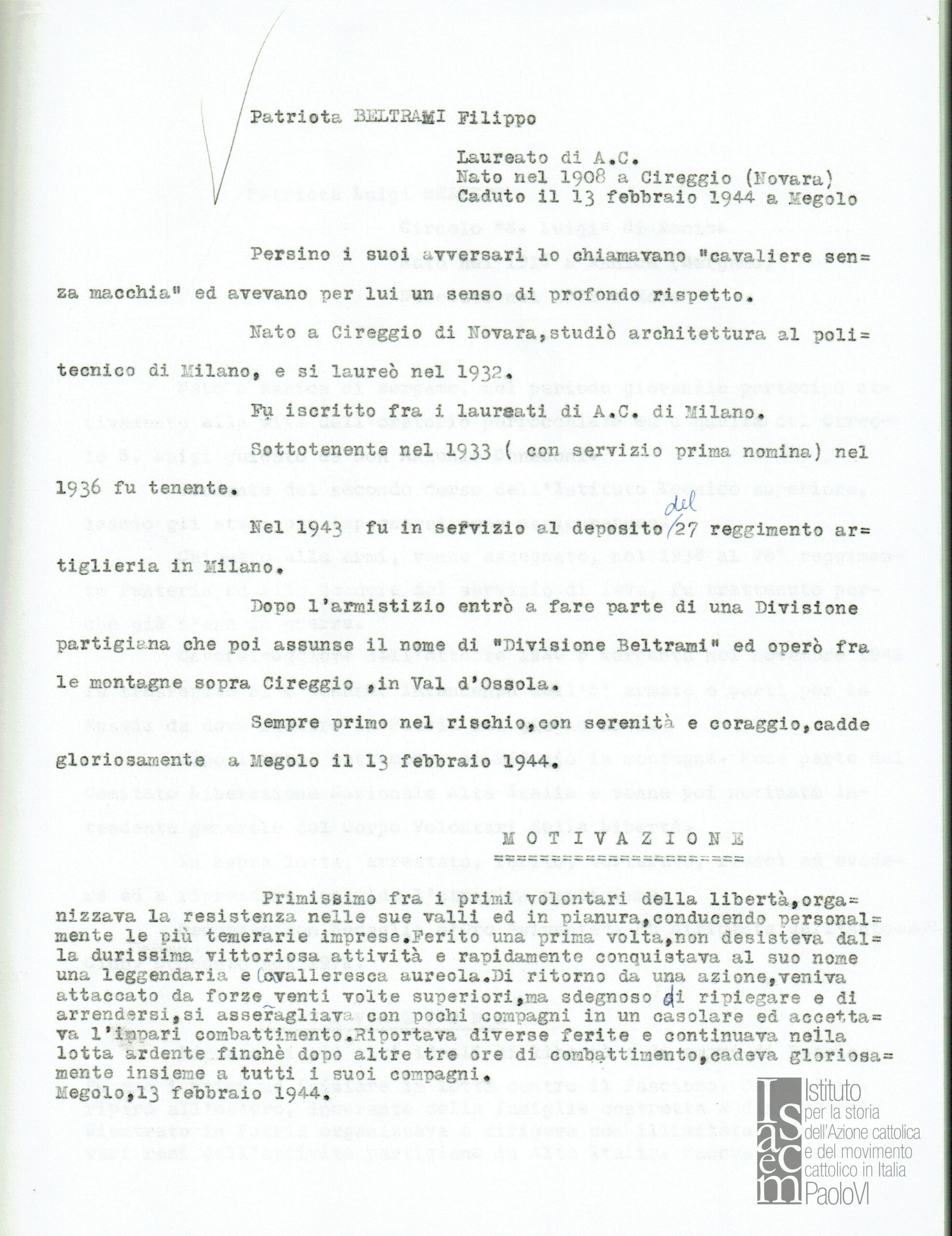 Profilo di Filippo Beltrami sull'albo di gloria dei caduti di Azione cattolica nella Resistenza. Isacem, Righini, b. 26, fasc. 4a
