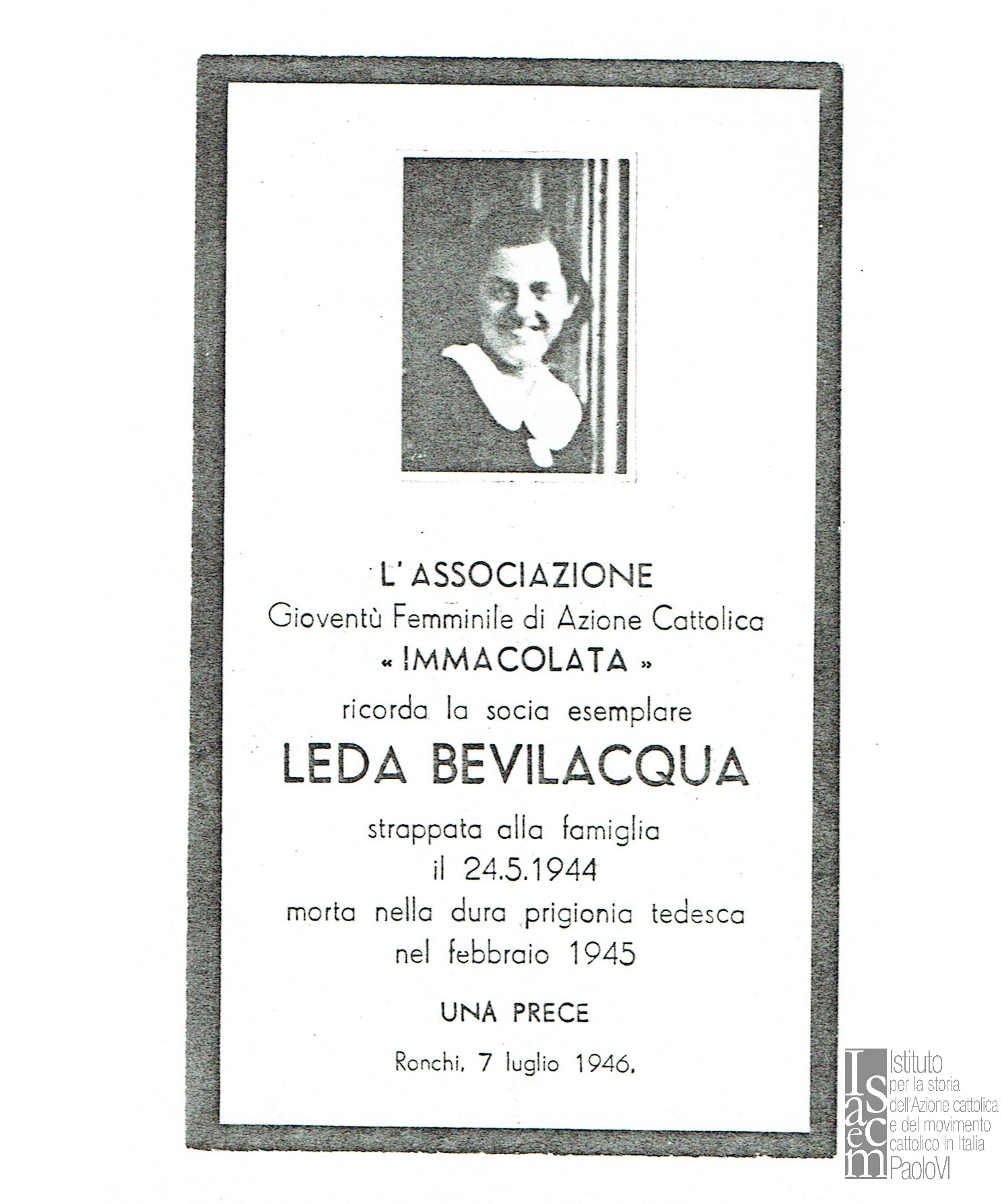 Ricordo funebre di Leda Bevilacqua. Documento tratto da: Il diario della memoria. Ronchi 1945-1995, s.l., 1995.