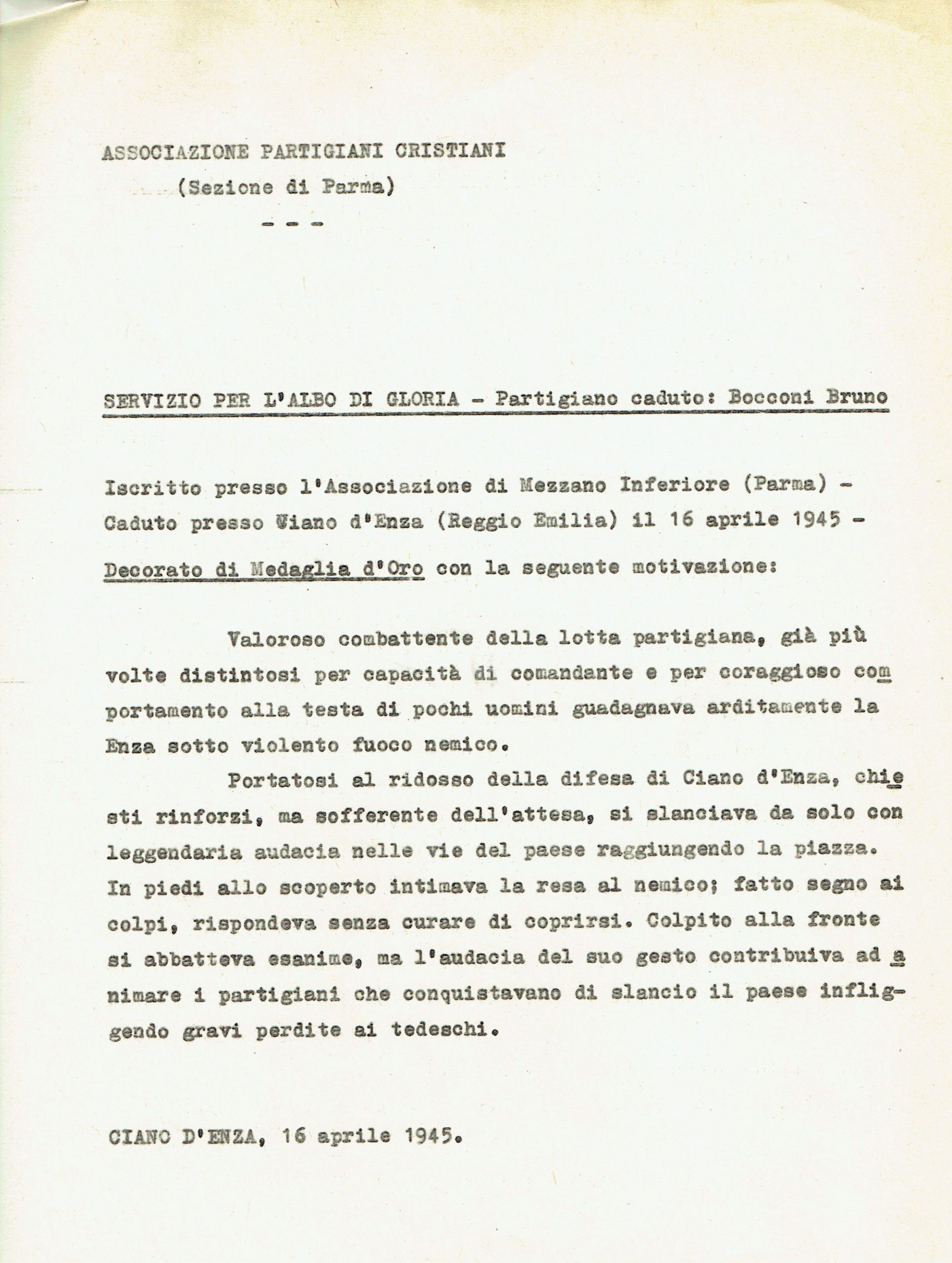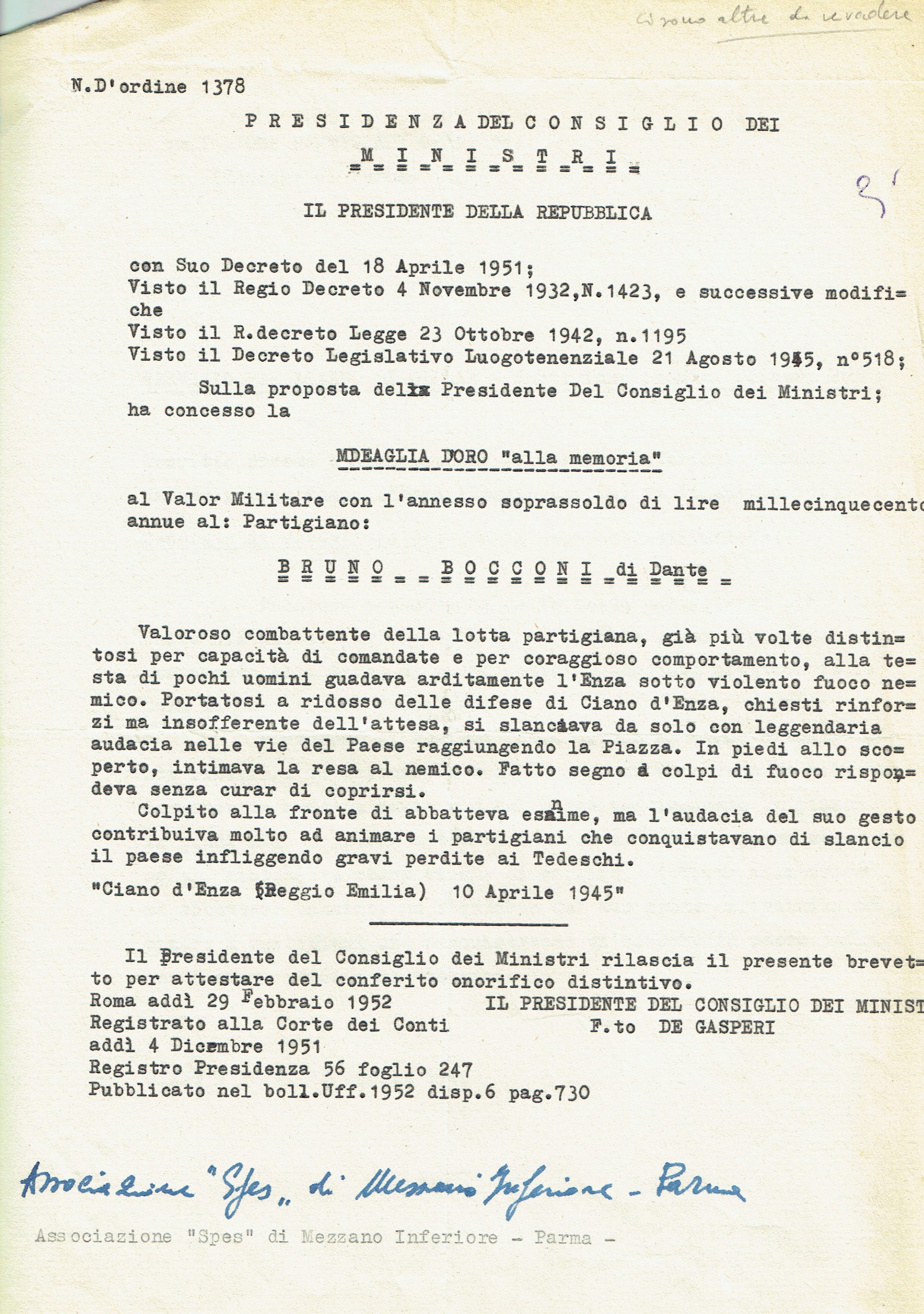 Decreto del presidente del Consiglio Alcide De Gasperi per la concessione della medaglia d'oro al valor militare a Bruno Bocconi. Isacem, Giac, b. 772, fasc. Biagioli-Bonetti