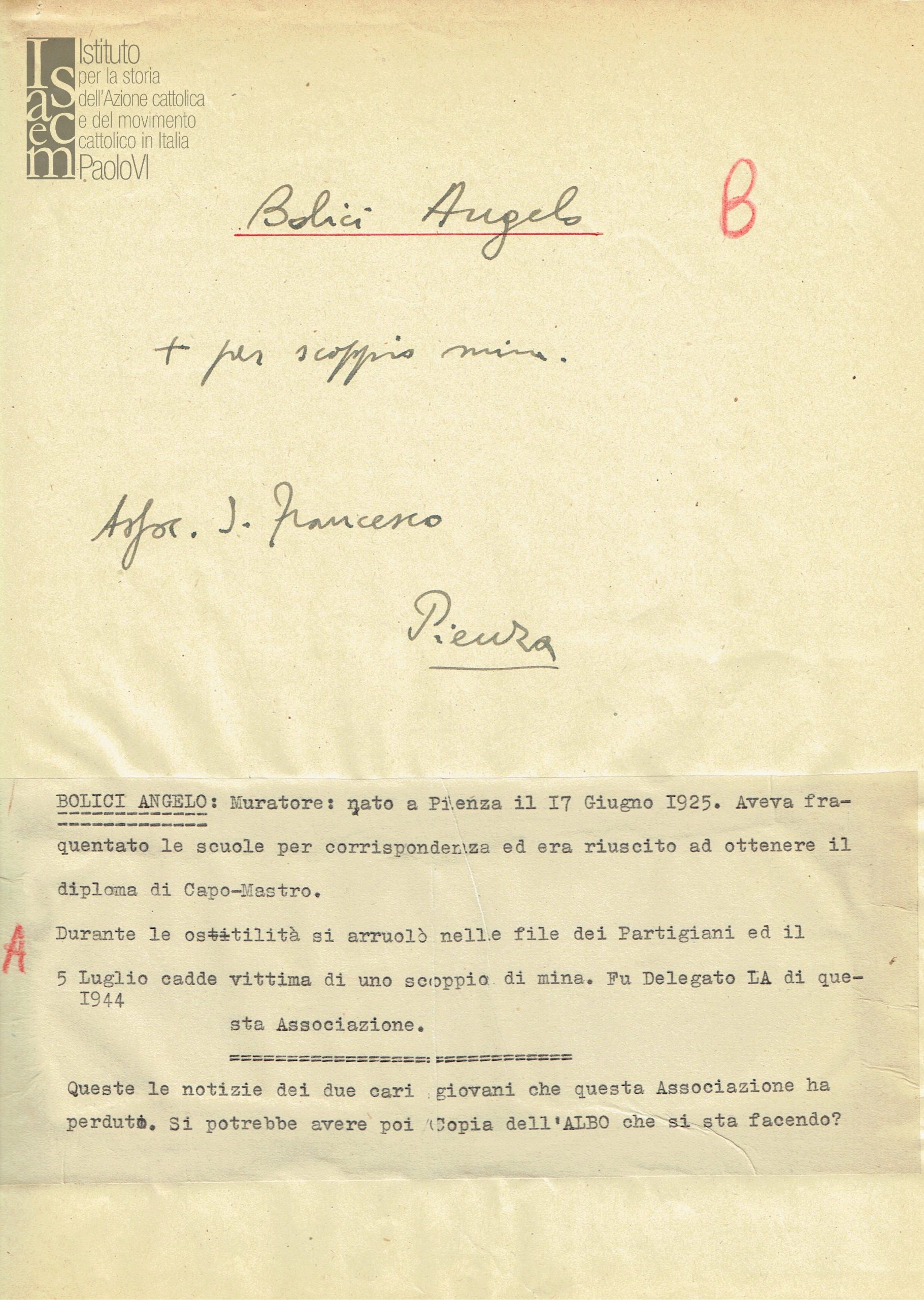 Raccolta informazioni della Giac per la compilazione dell'albo di gloria dei caduti nella Resistenza. Isacem, Giac, b. 772, fasc. Biagioli-Bonetti
