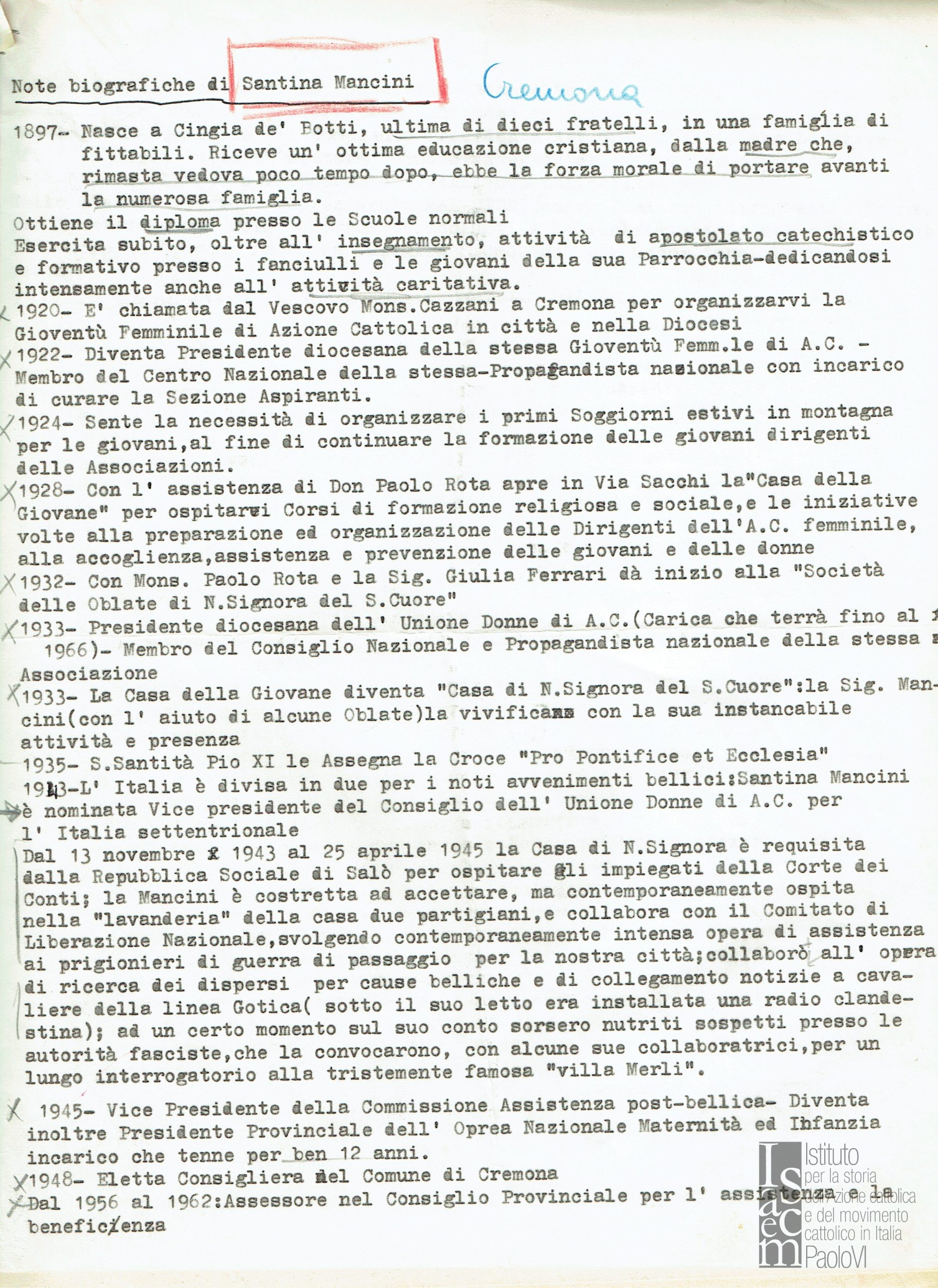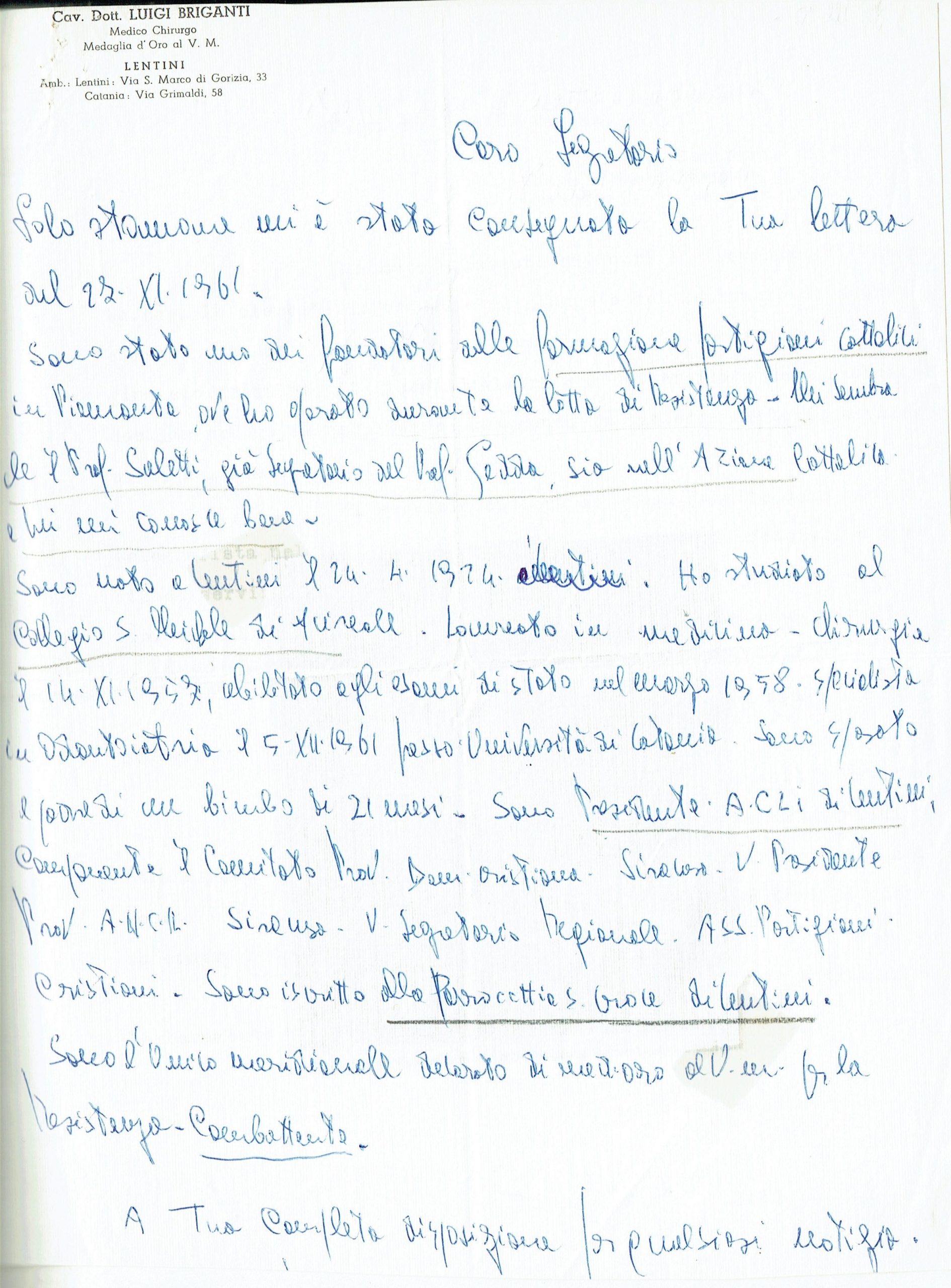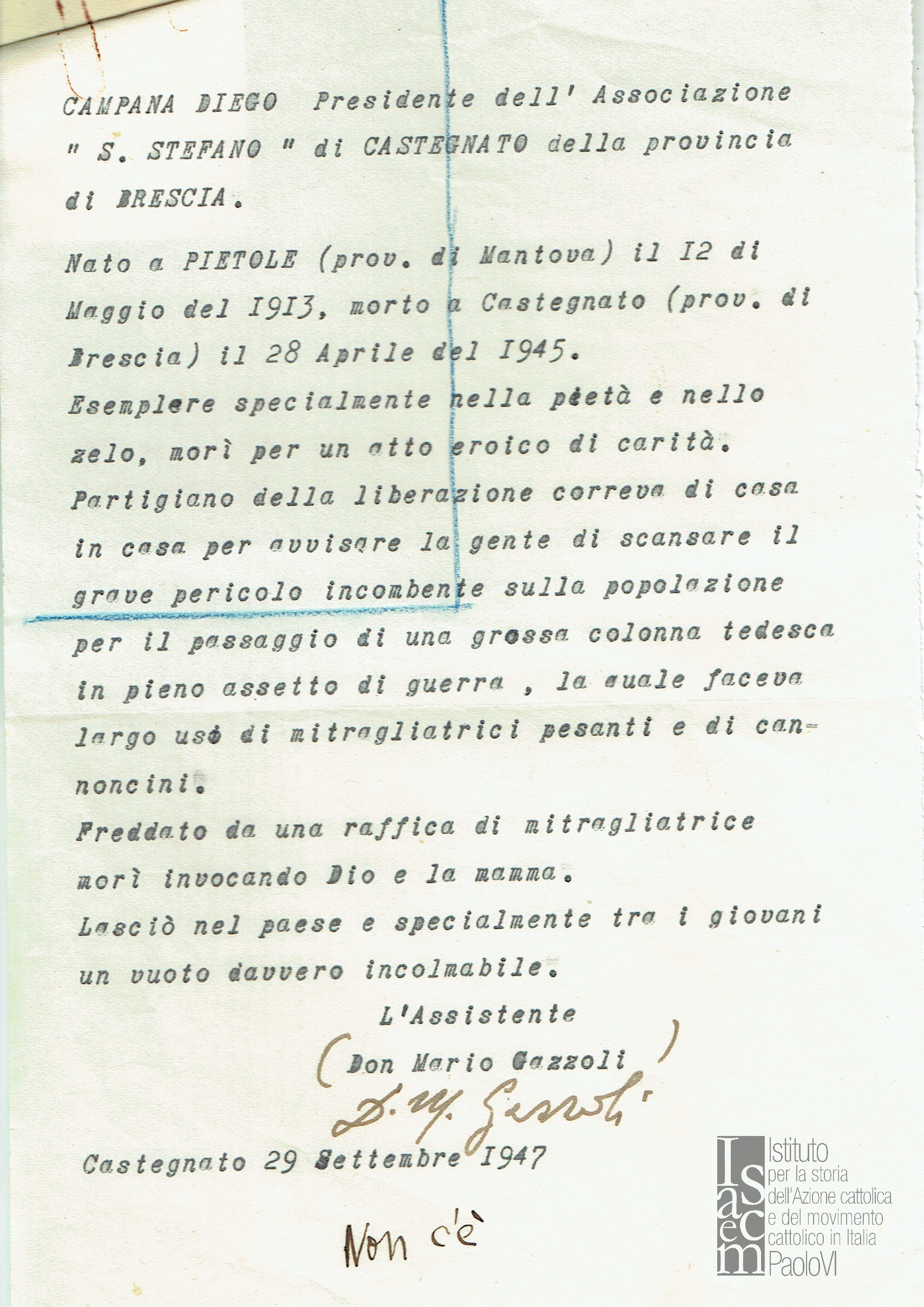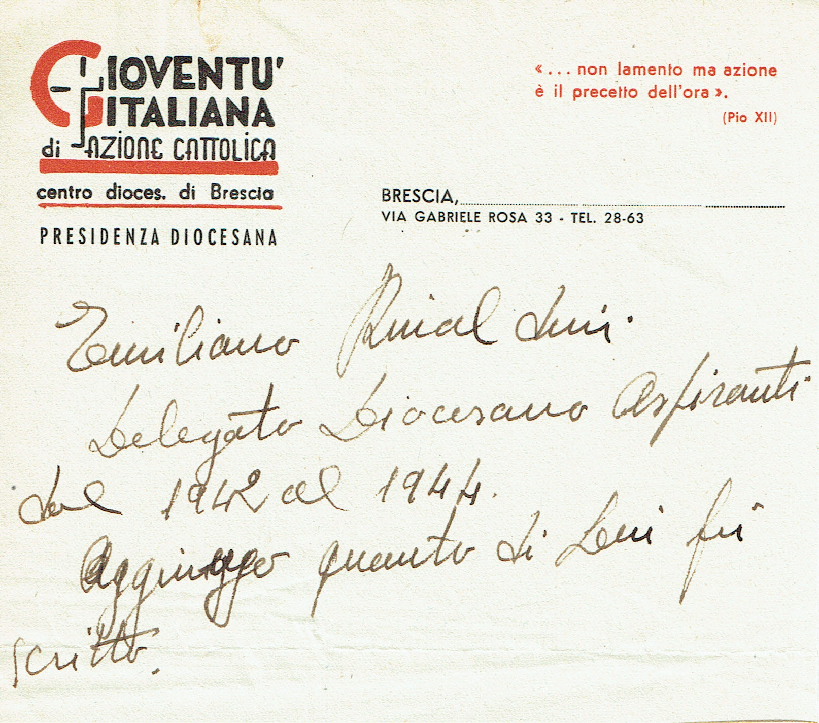 Lettera del Centro diocesano di Brescia alla Presidenza centrale per presentare la figura di Emiliano Rinaldini. Isacem, Giac, b. 775, fasc. Rabbolini-Ritano