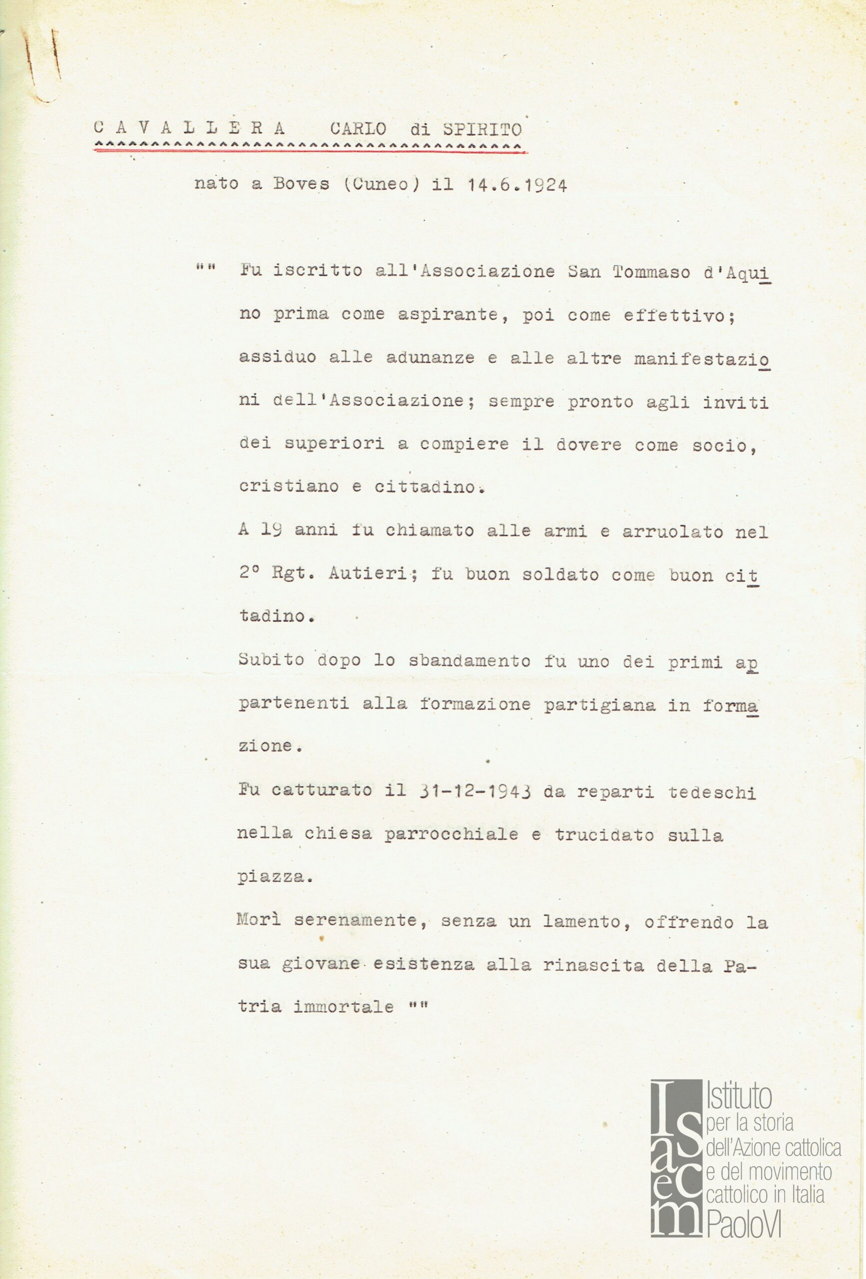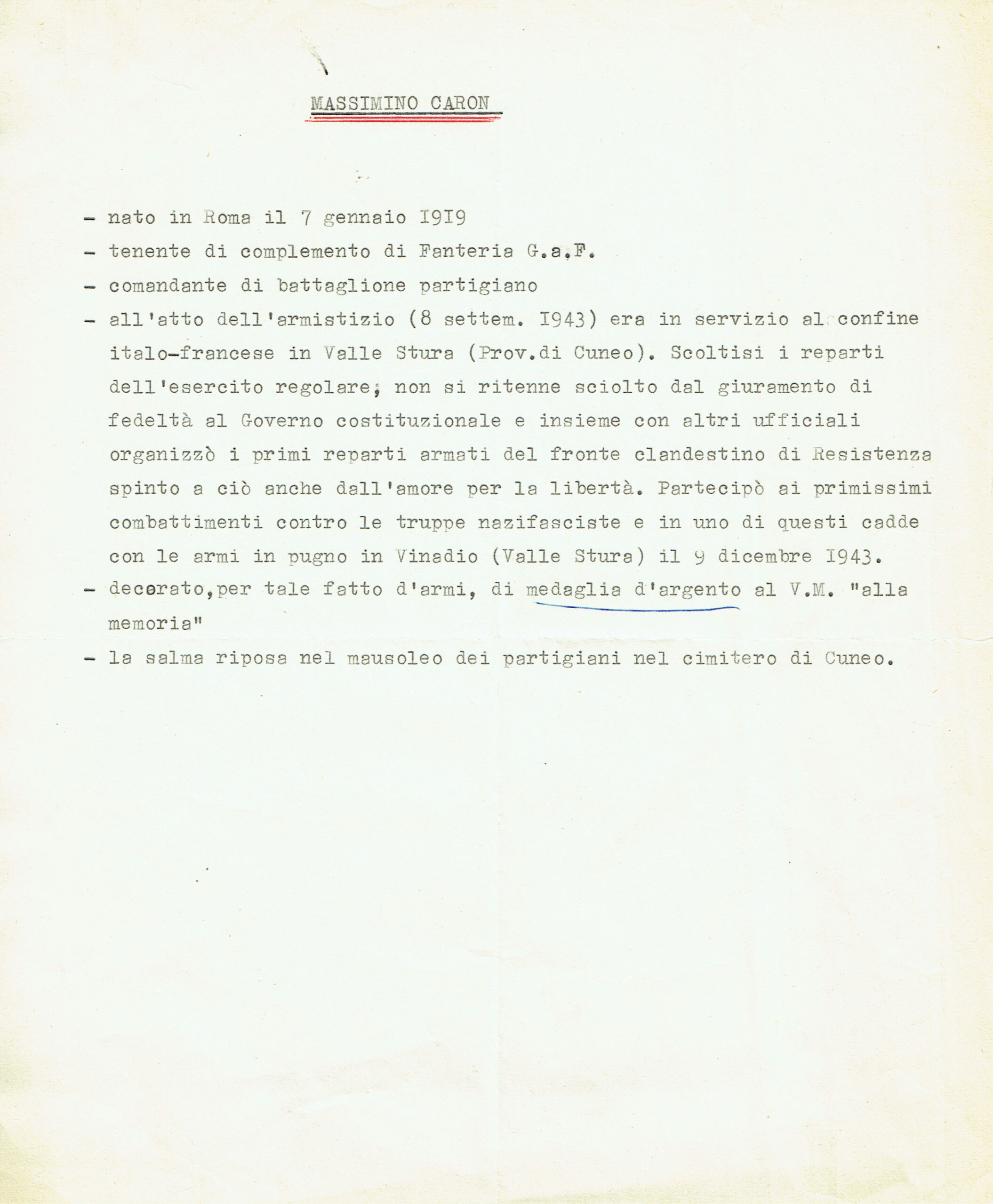 Notizie biografiche di Massimino Caron per la compilazione dell'albo di gloria dei caduti dell'Ac nella Resistenza. Isacem, Giac, b. 773, fasc. Carcassare-Cattani
