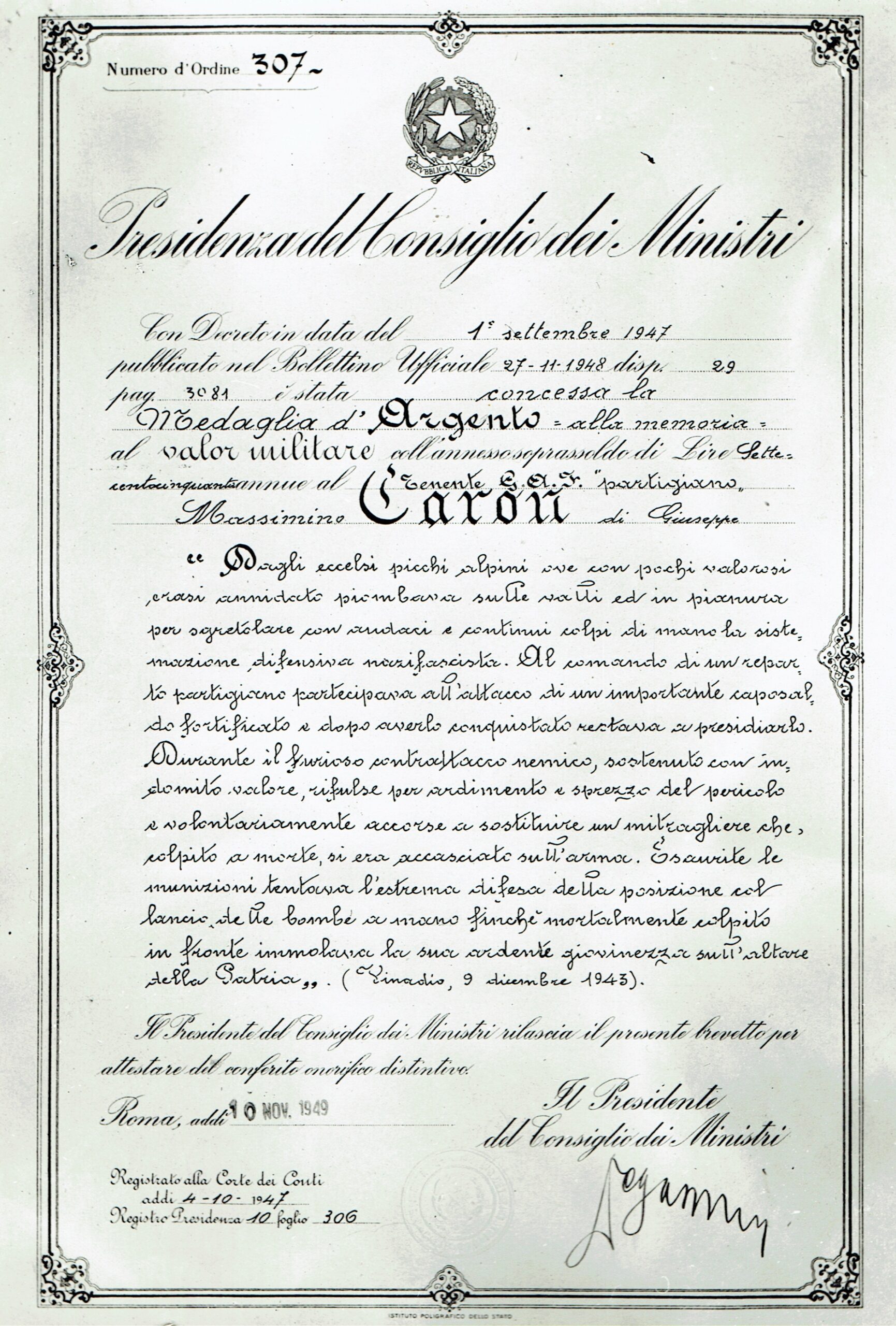 Motivazione della medaglia d'argento al valor militare concessa a Massimino Caron. Isacem, Giac, b. 773, fasc. Carcassare-Cattani