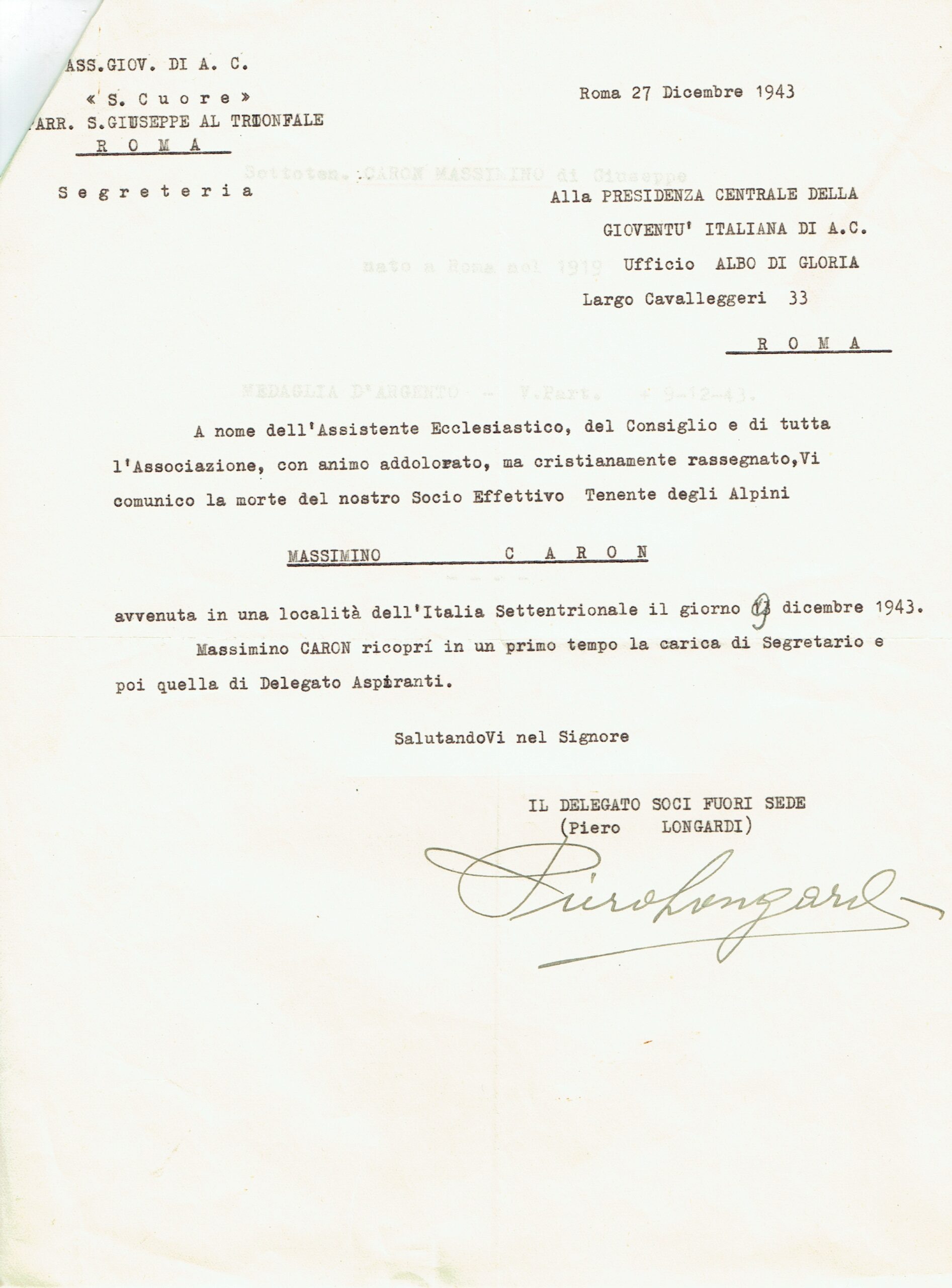Lettera del circolo Giac S. Cuore di Roma per comunicare la morte di Massimino Caron. Isacem, Giac, b. 773, fasc. Carcassare-Cattani