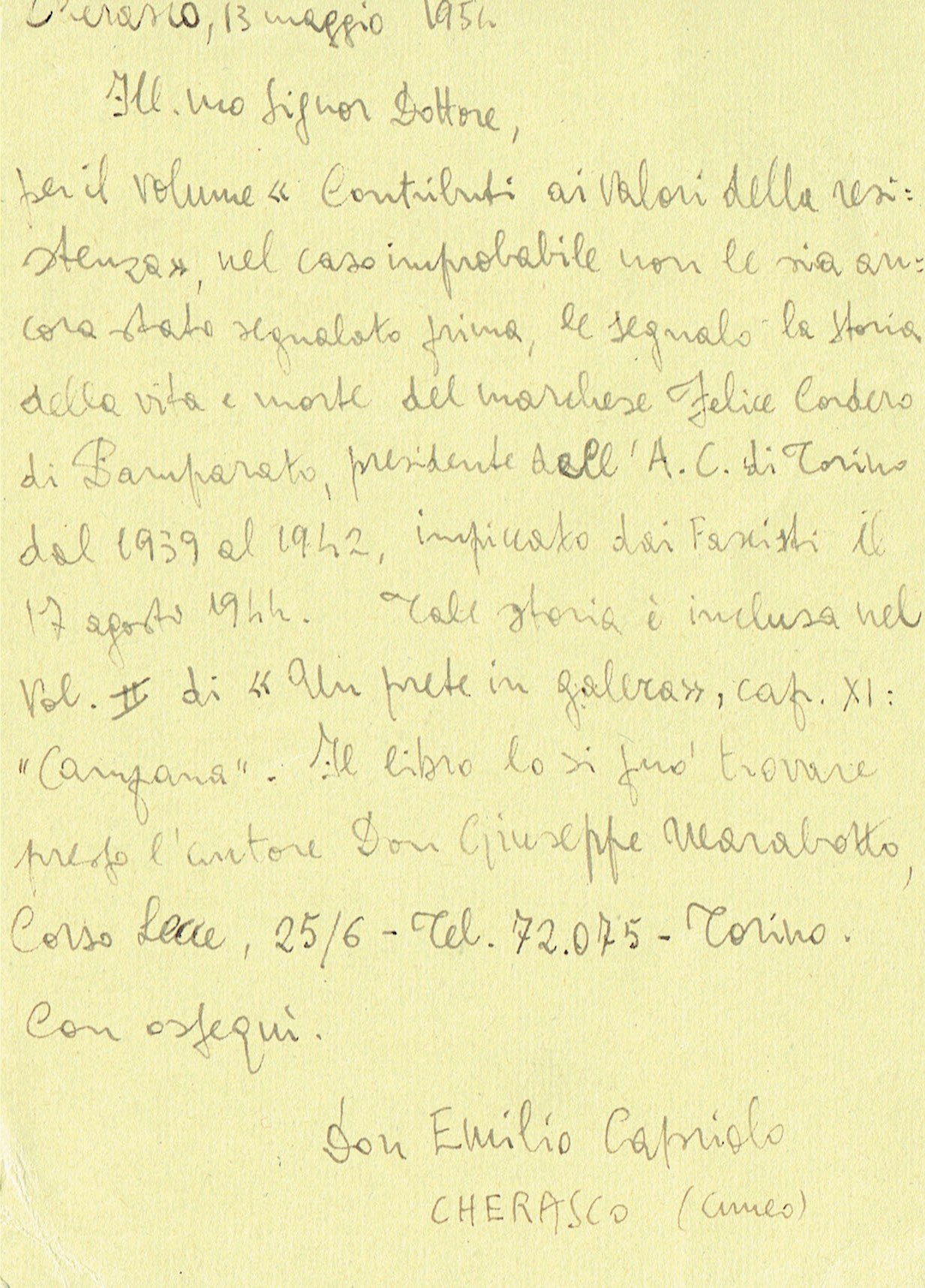 Lettera di don Emilio Capriolo per segnalare la figura di Felice Cordero di Pamparato. Isacem, Giac, b. 778, fasc. Materiale per la mostra della Resistenza
