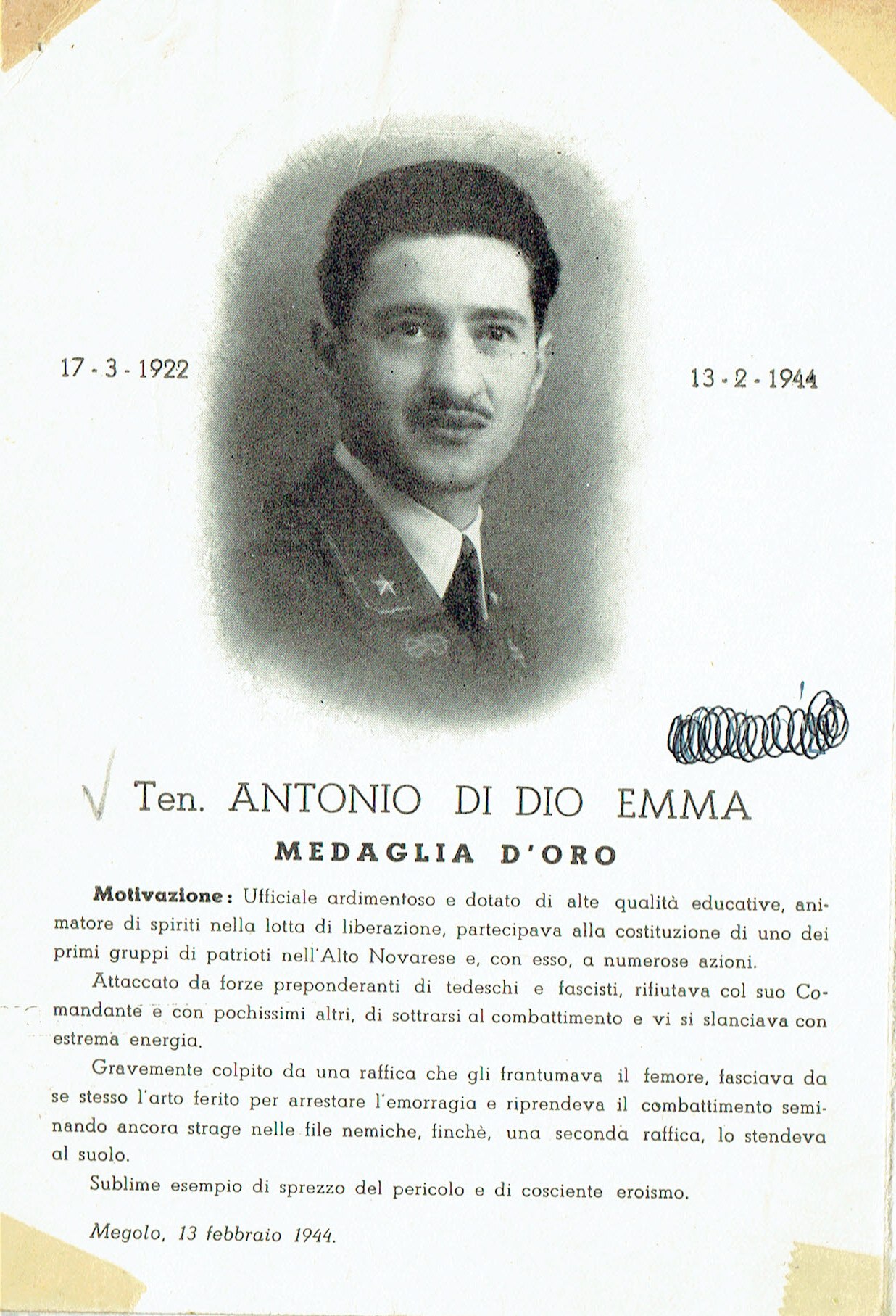 Motivazione medaglia d'oro al valor militare concessa ad Antonio Di Dio. Isacem, Giac, b. 770, fasc. 4a