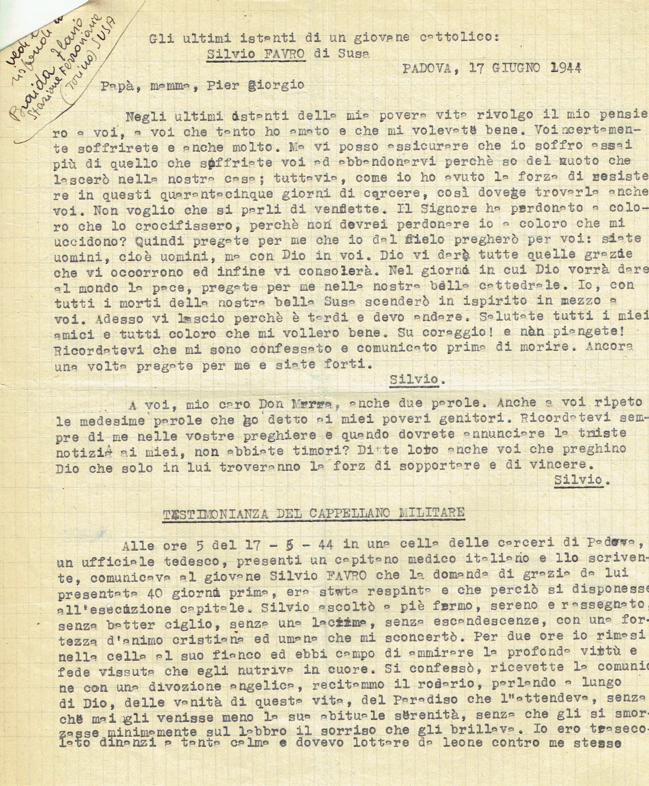 Ultima lettera di Silvio Favro e testimonianza del cappellano militare. Isacem, Giac, b. 773, fasc. Fabbriani-Feola