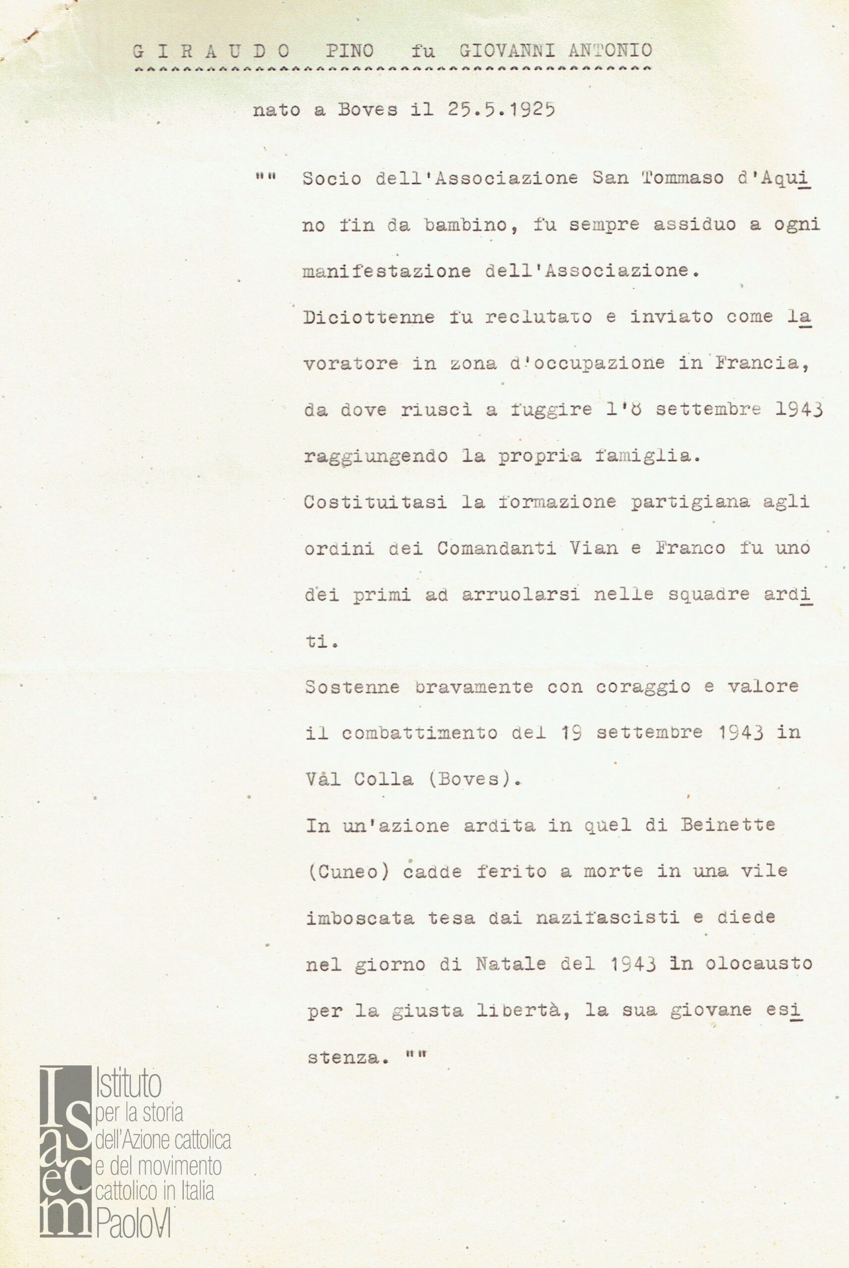 Note biografiche di Giuseppe Giraudo. Isacem, Giac, b. 774, fasc. Gedda-Gizzi