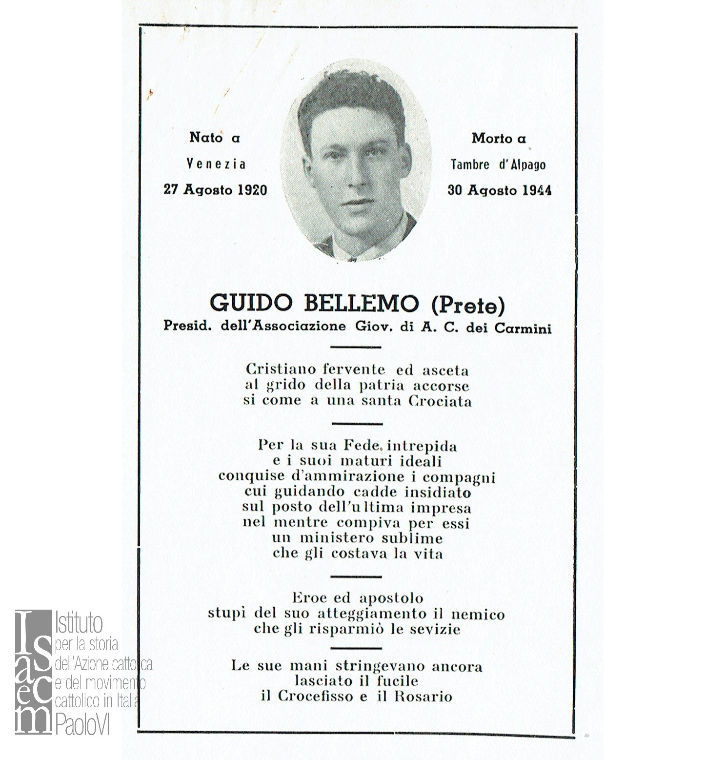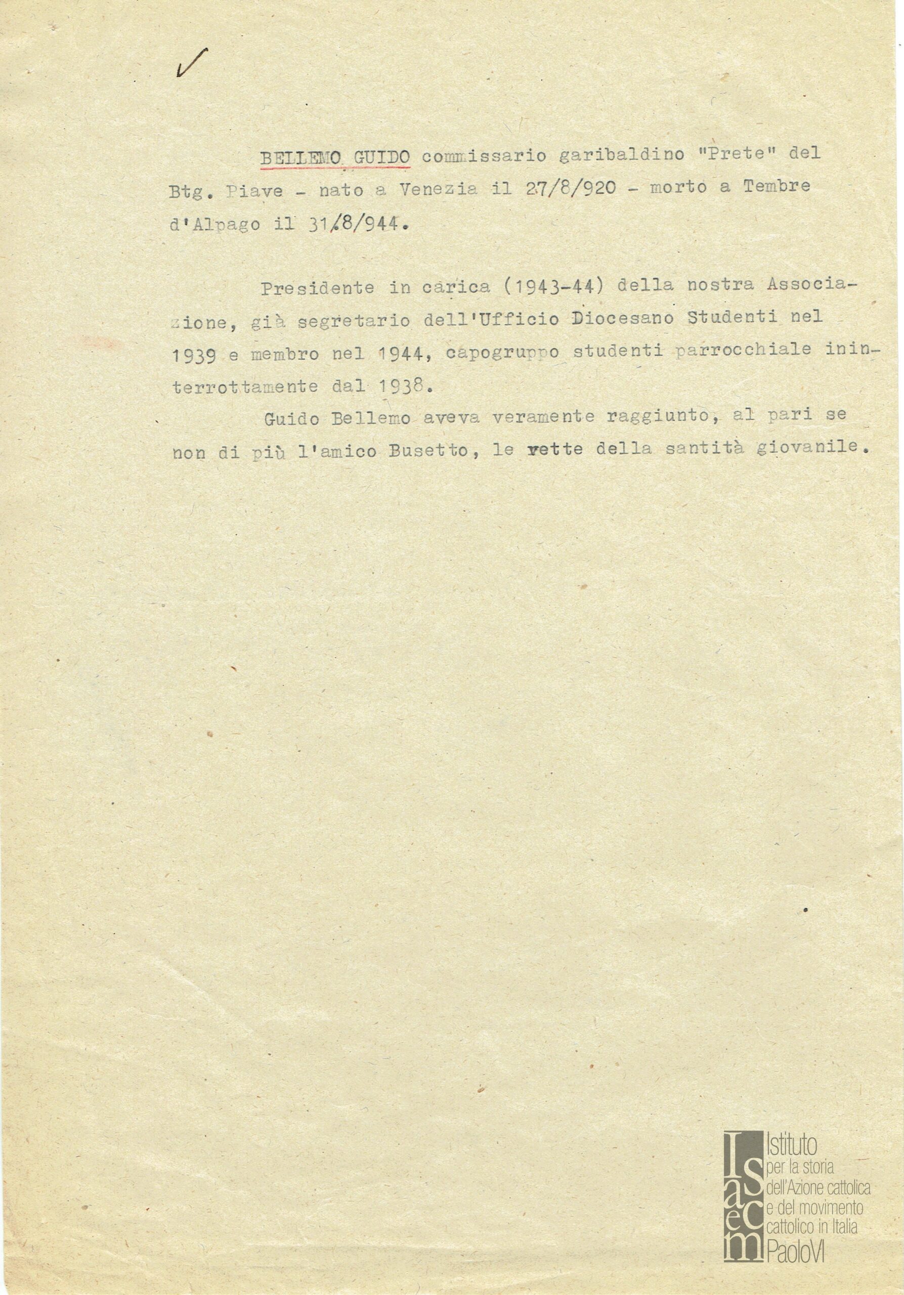 Lettera dell'associazione G. Bellemo di Venezia con informazioni su Guido Bellemo (Prete). Isacem, Giac, b. 772, fasc. Bascapè-Beotti