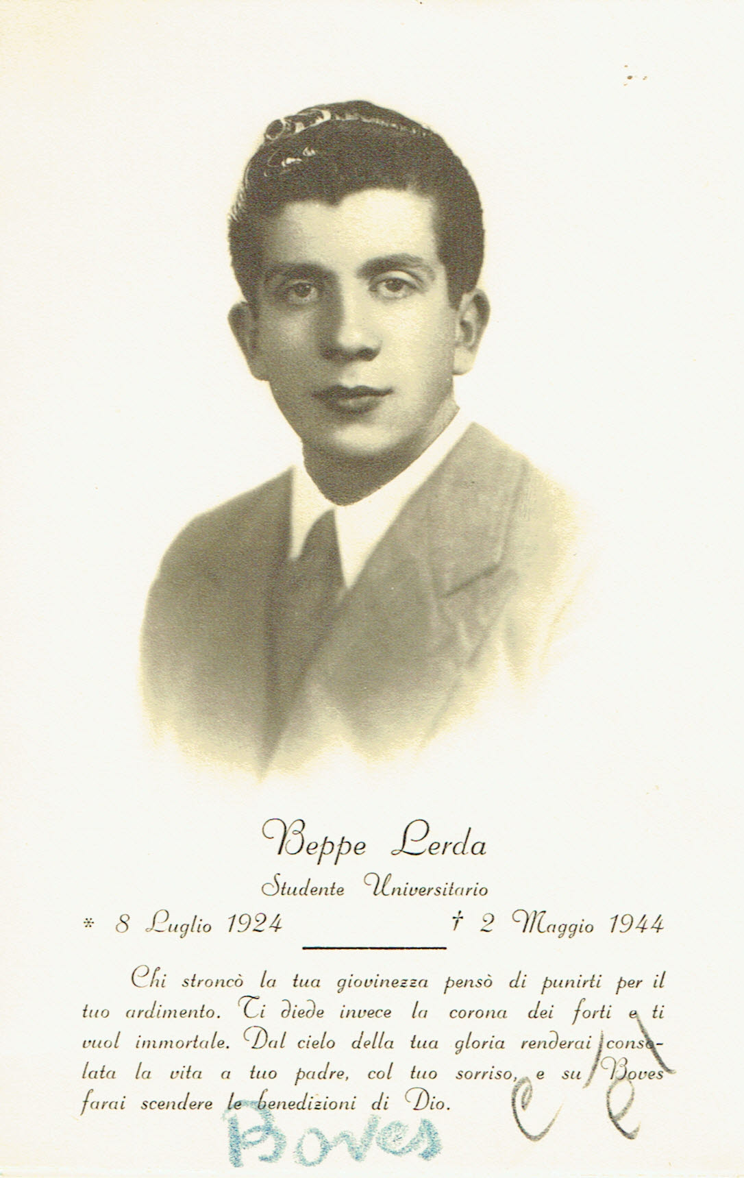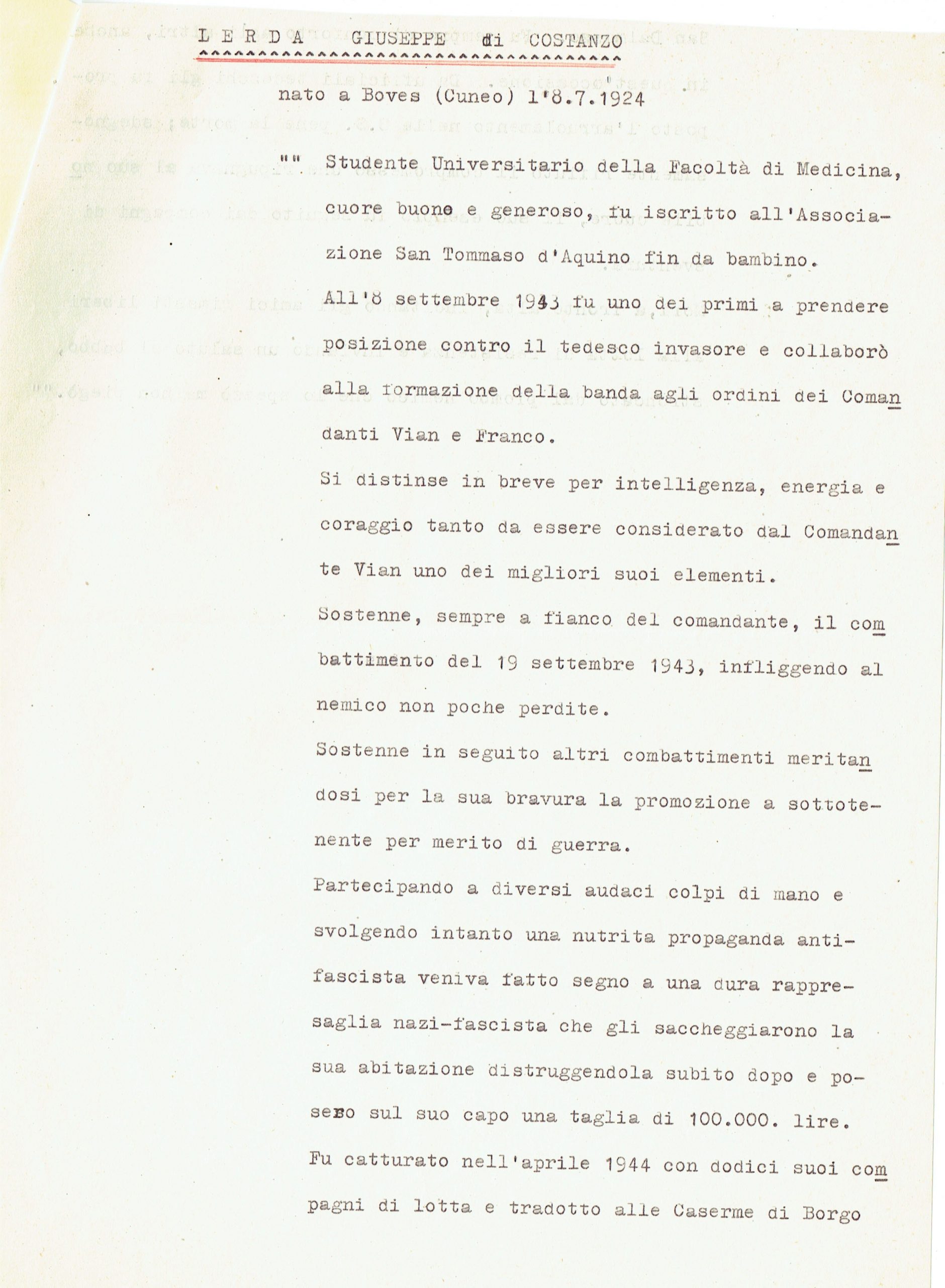 Notizie biografiche di Giuseppe Lerda per l'albo di gloria dei caduti dell'Azione cattolica nella Resistenza. Isacem, Giac, b. 774, fasc. Lacchini-Lizzi