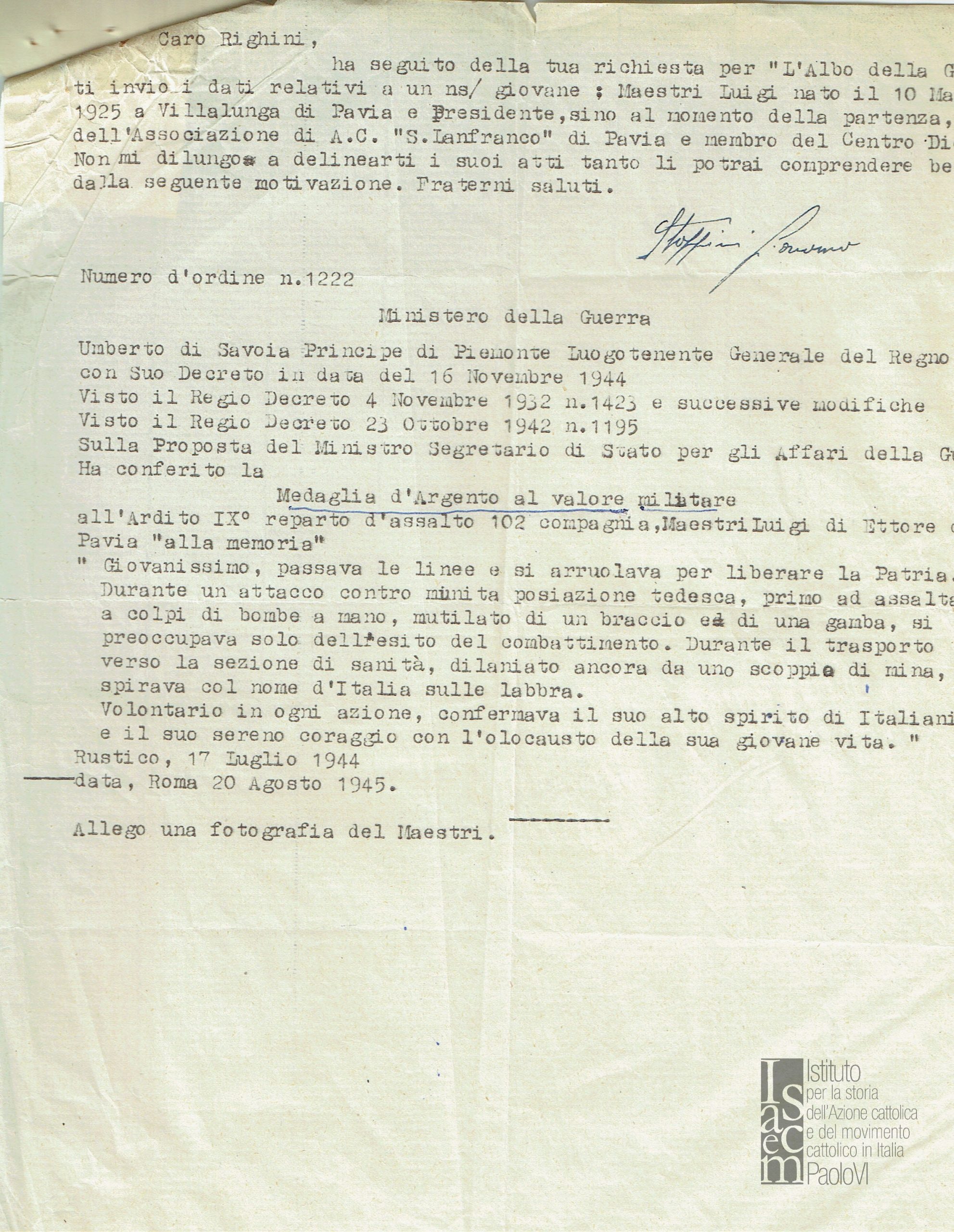 Concessione medaglia d'argento a Luigi Piccoli. Isacem, Giac, b. 775, fasc. Piacentini-Pizzoni