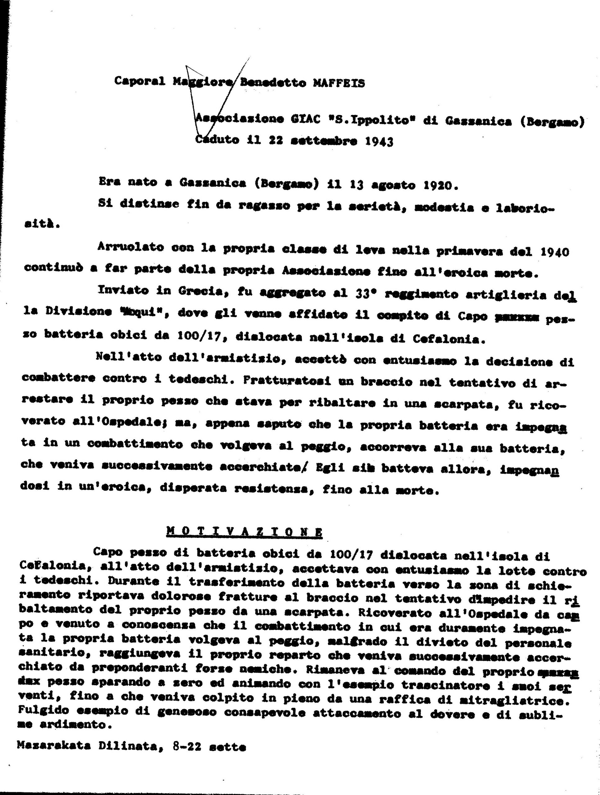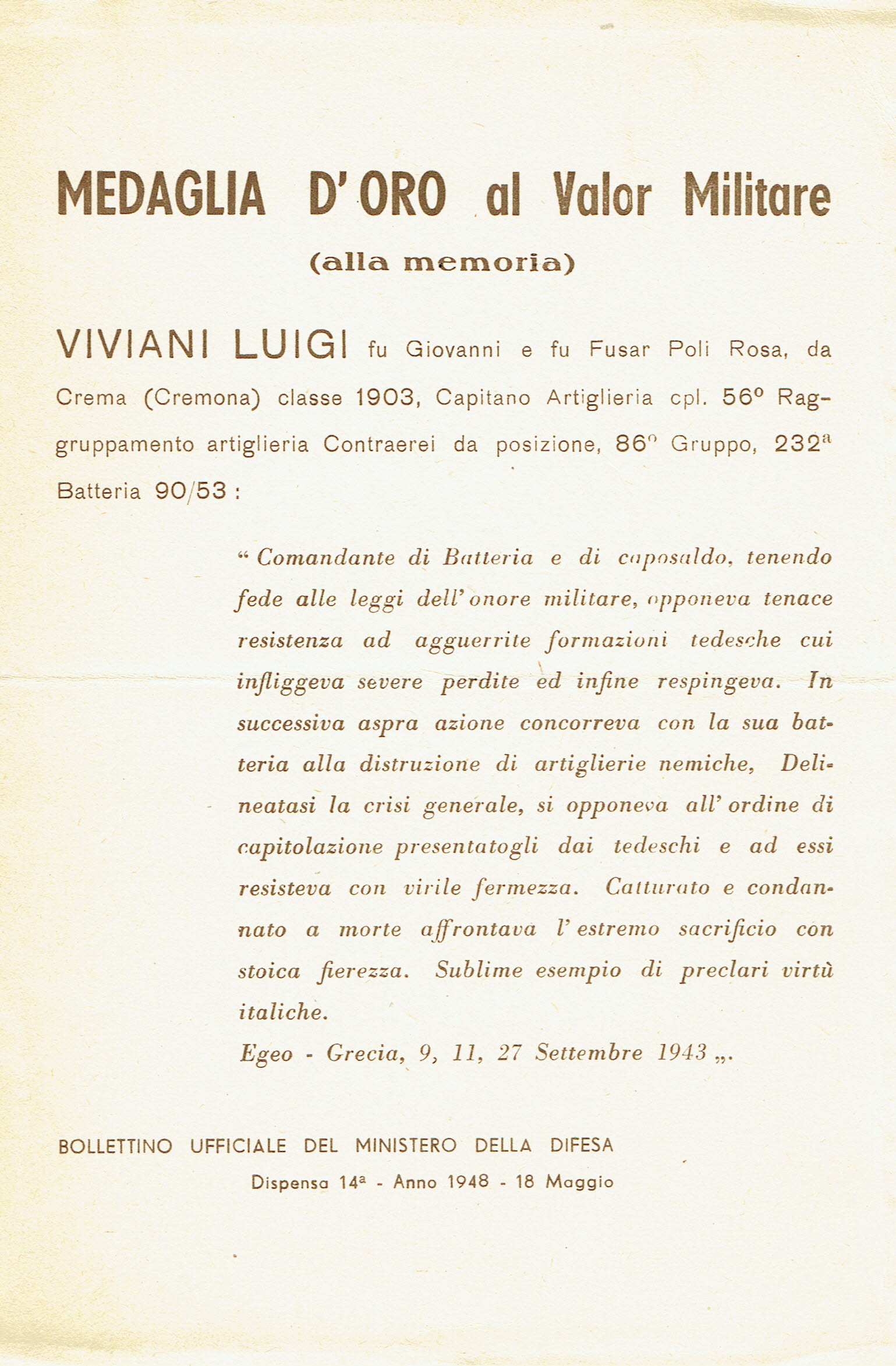 Motivazione della medaglia d'oro al valore militare. Isacem, Giac, b. 776, fasc. Verardo-Vuano