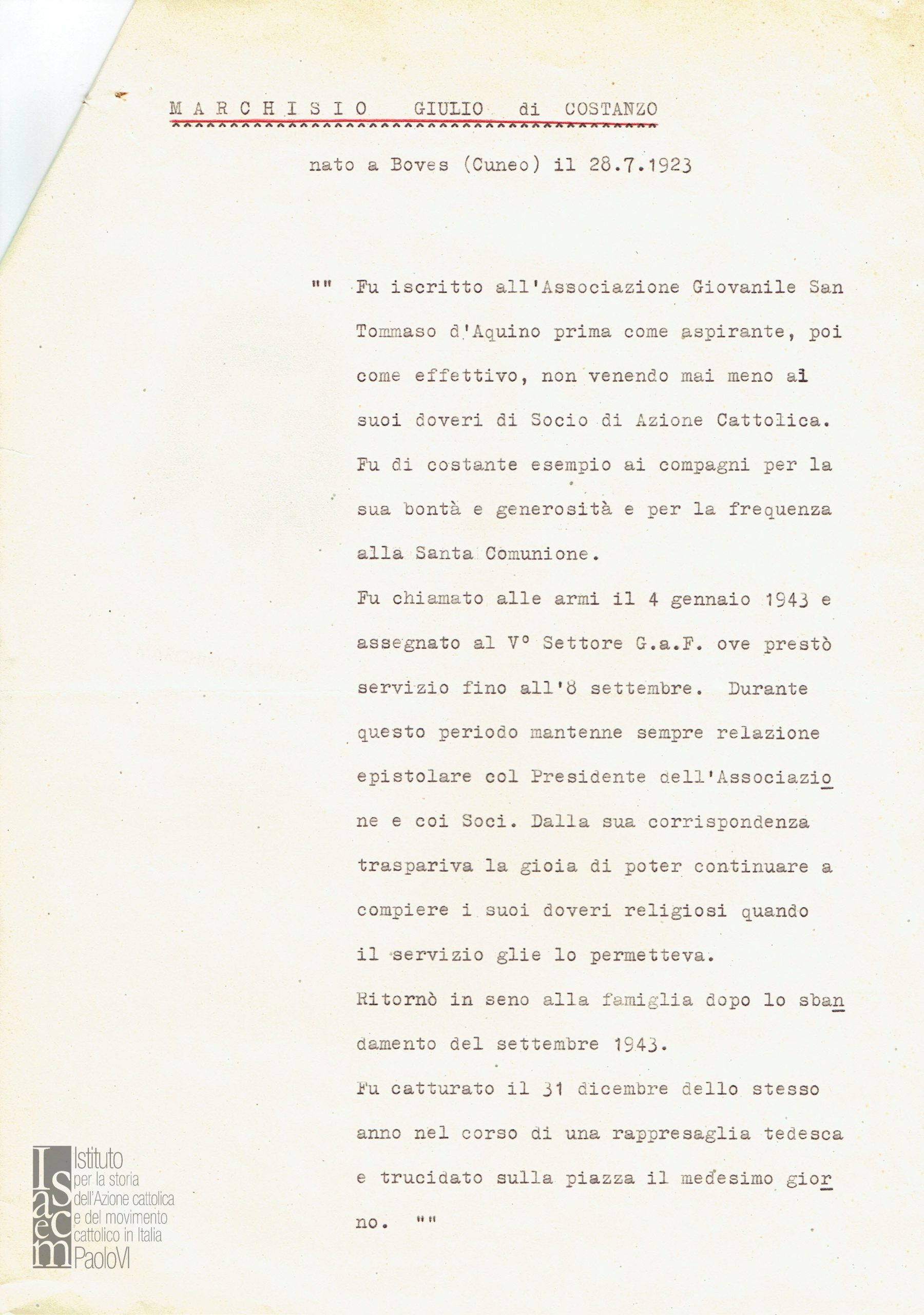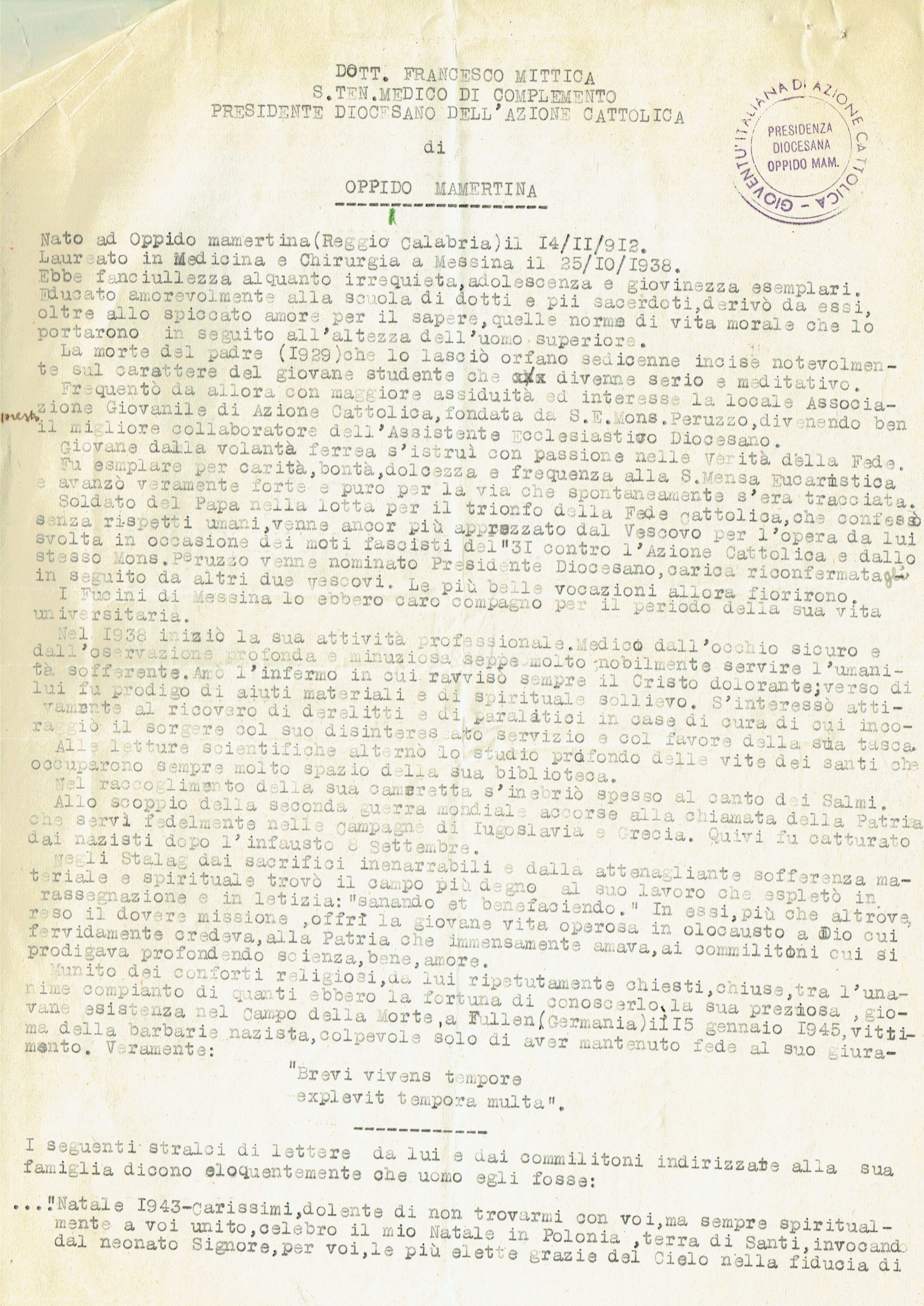 Notizie biografiche di Francesco Mittica per l'albo di gloria dei caduti dell'Azione cattolica nella Resistenza. Isacem, Giac, b. 774, fasc. Meoni-Monica