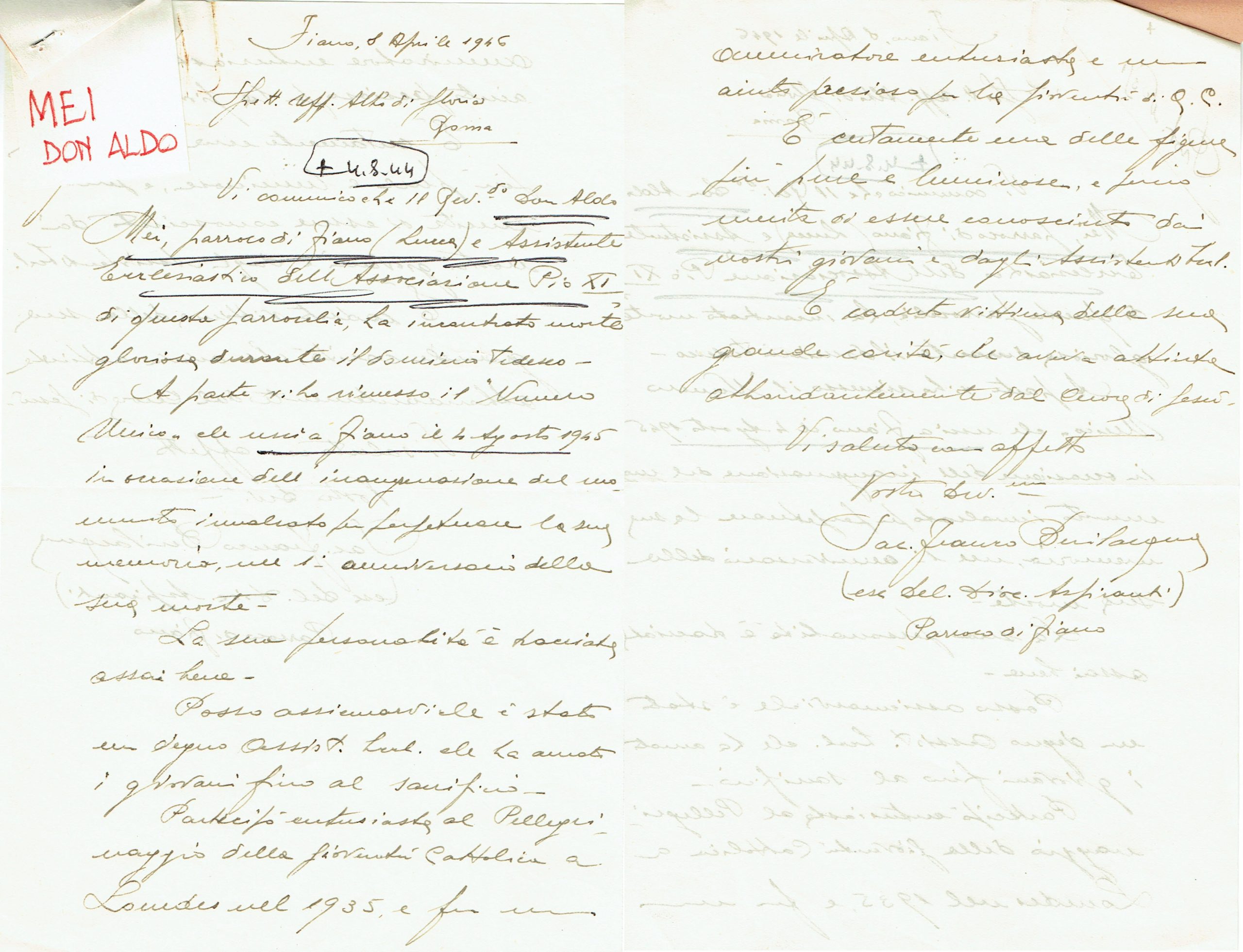 Raccolta informazioni su Aldo Mei per la compilazione dell'albo di gloria dei caduti dell'Azione cattolica nella Resistenza. Isacem, Giac, b. 774, fasc. Meoni-Moni