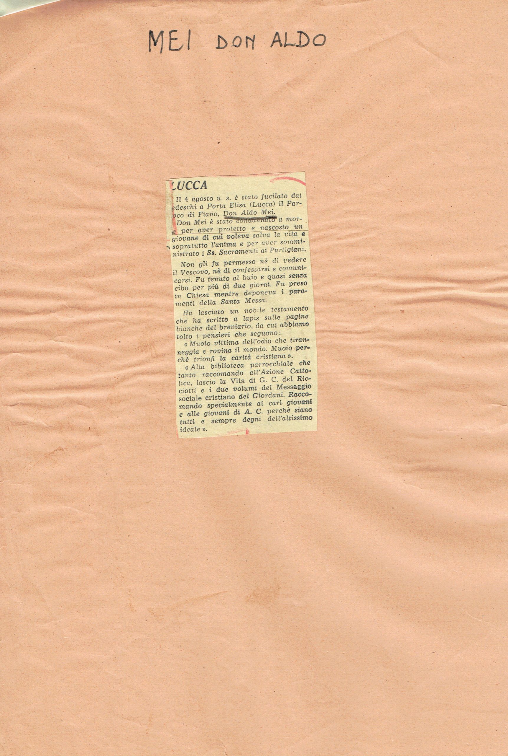 Breve articolo sulla morte di don Aldo Mei. Isacem, Giac, b. 774, fasc. Meoni-Moni