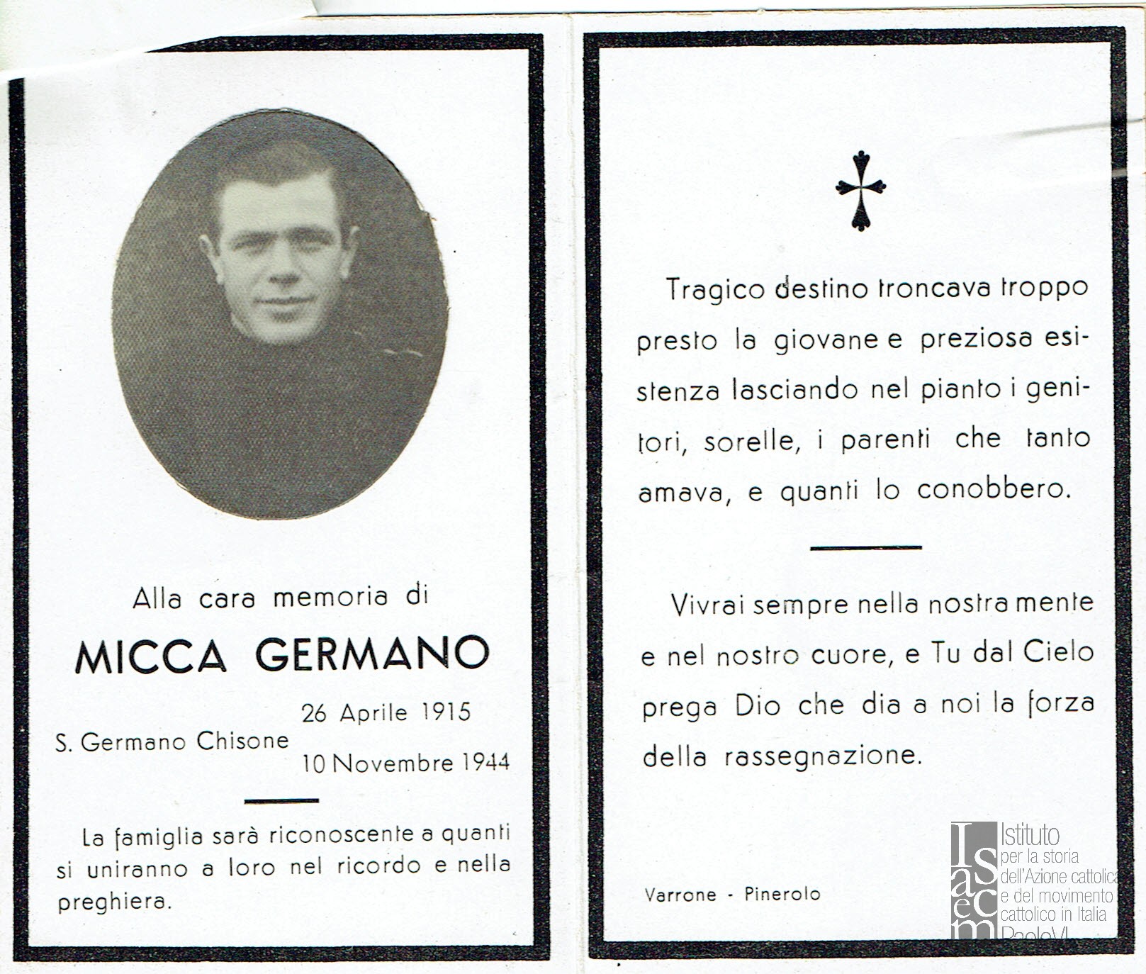 Ricordo funebre di Germano Micca. Isacem, Giac, b. 774, fasc. Meoni-Monica