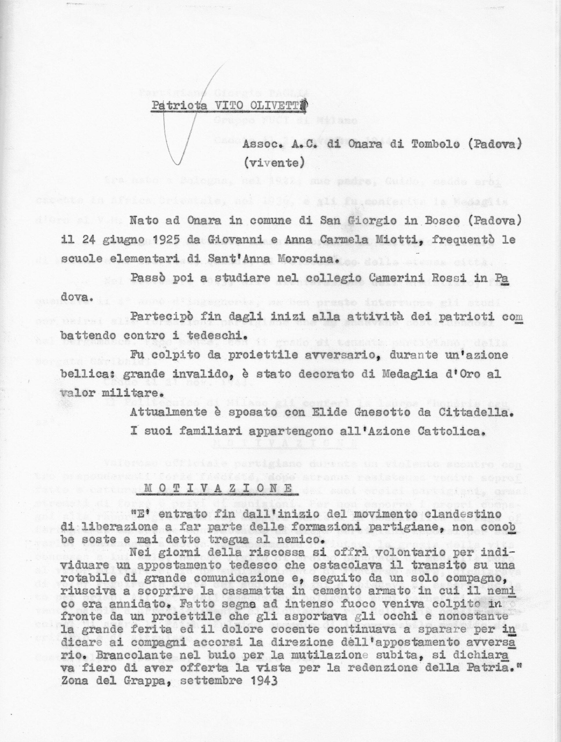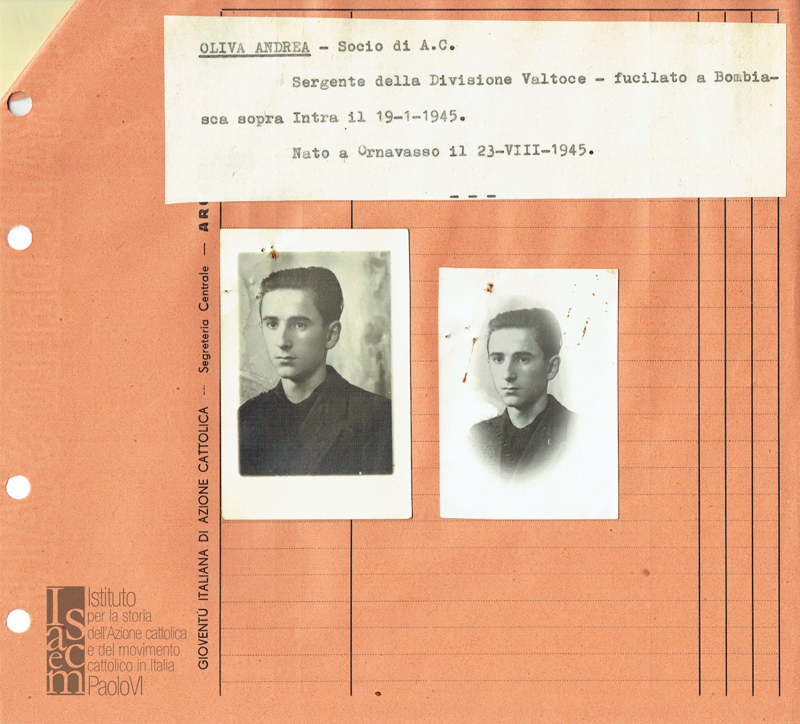 Profilo di Vito Olivetti sull'albo di gloria dei caduti di Azione cattolica nella Resistenza. Isacem, Righini, b. 26, fasc. 4a