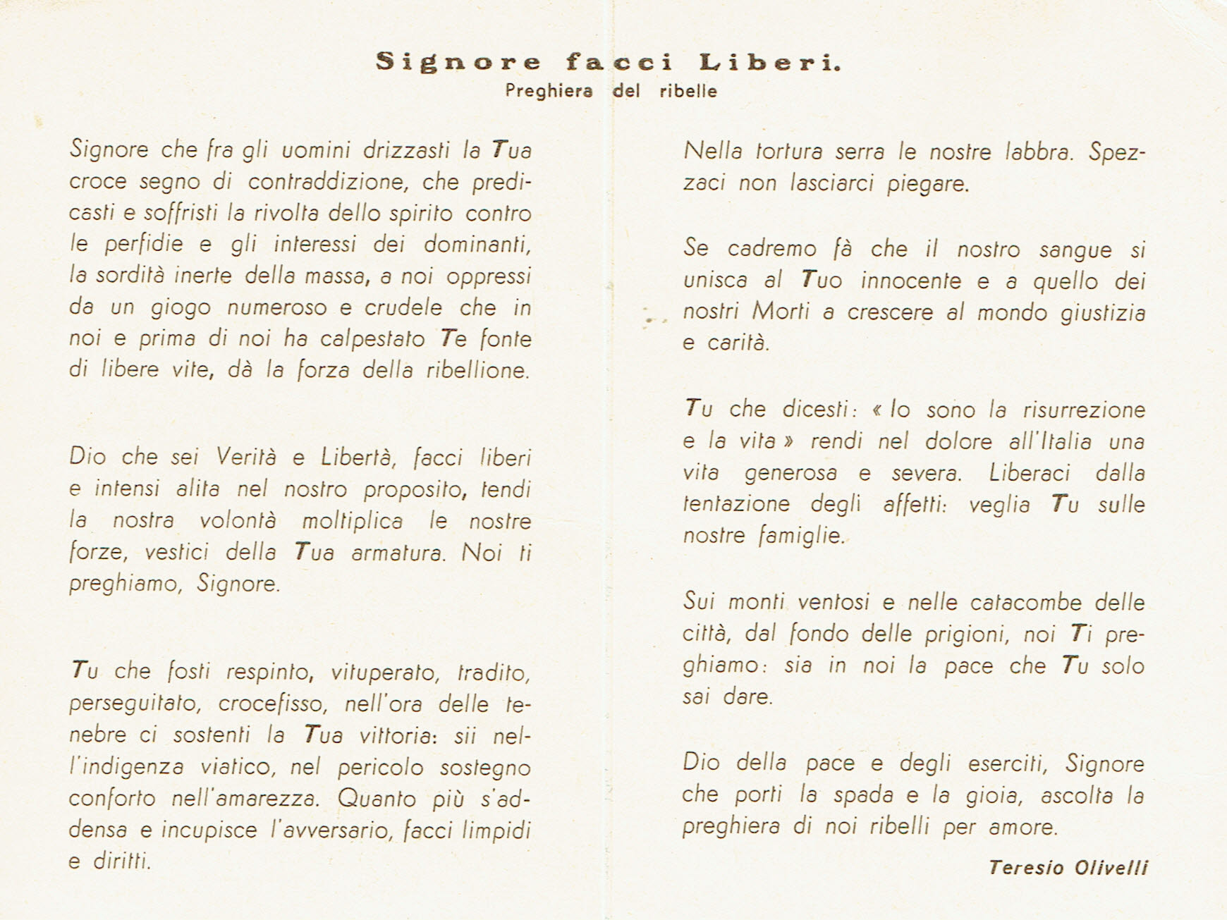 Testo della "Preghiera del ribelle" riportata sul retro del ricordo funebre di Teresio Olivelli. Isacem, Giac, b. 775, fasc. Odinolfi-Ottone