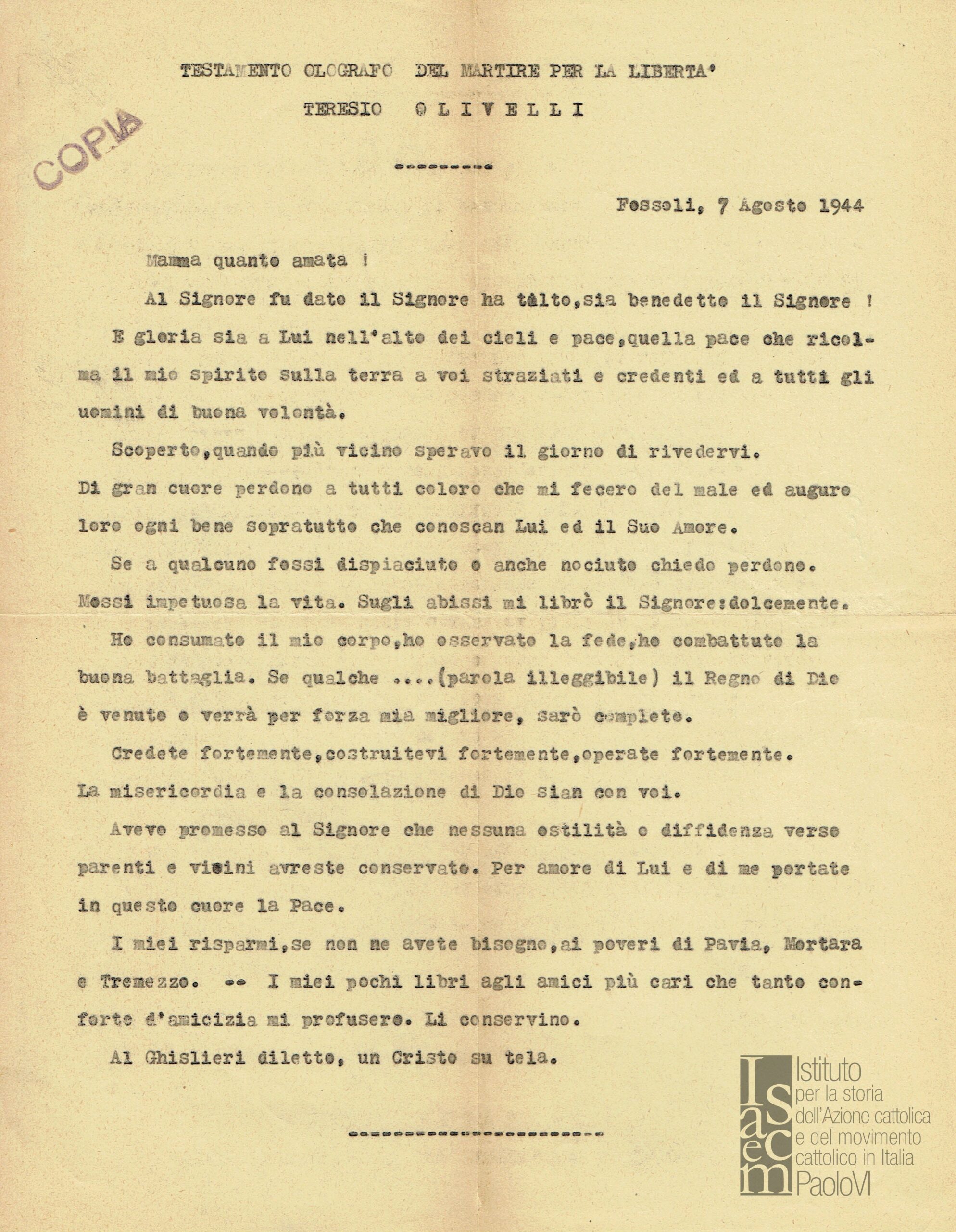 Copia del testamento olografo di Teresio Olivelli. Isacem, Righini, Biografie, b. 17, fasc. Olivelli Teresio.