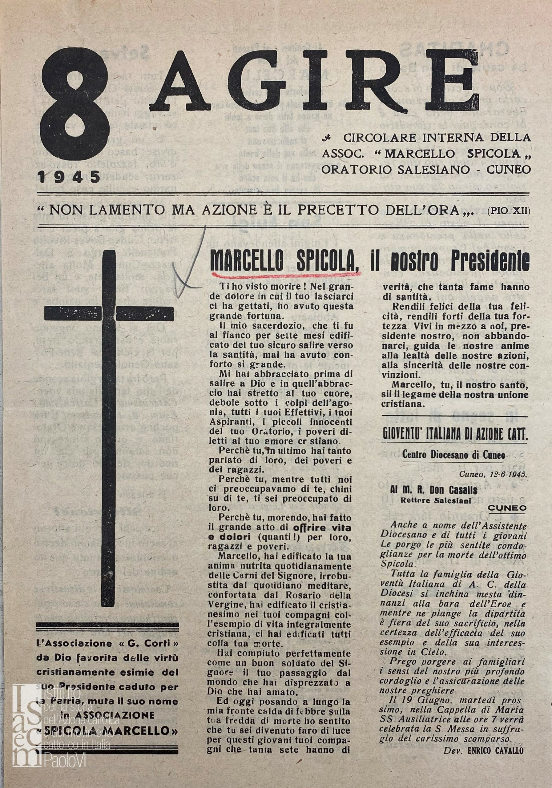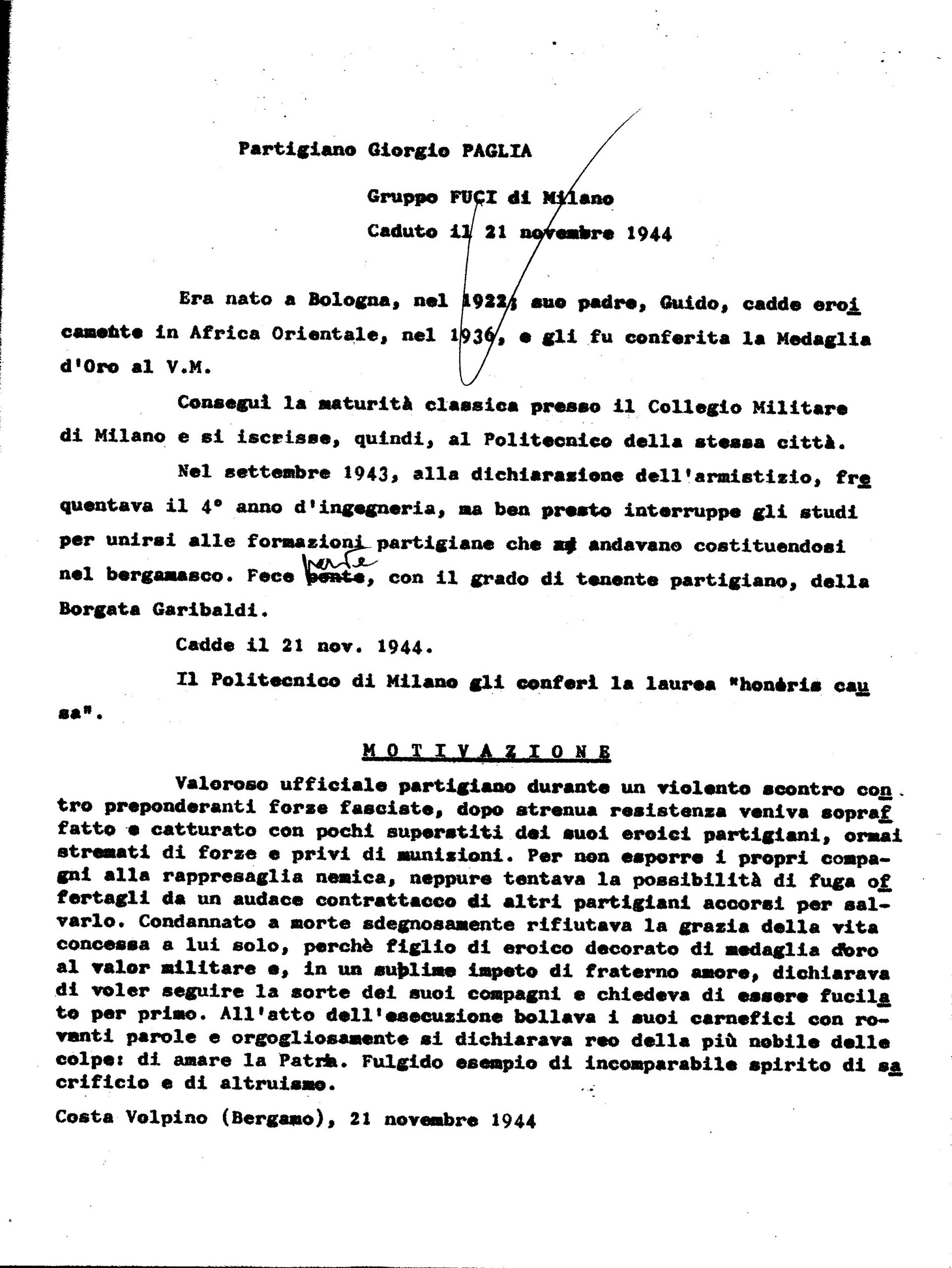 Profilo di Giorgio Paglia sull'albo di gloria dei caduti di Azione cattolica nella Resistenza. Isacem, Righini, b. 26, fasc. 4a