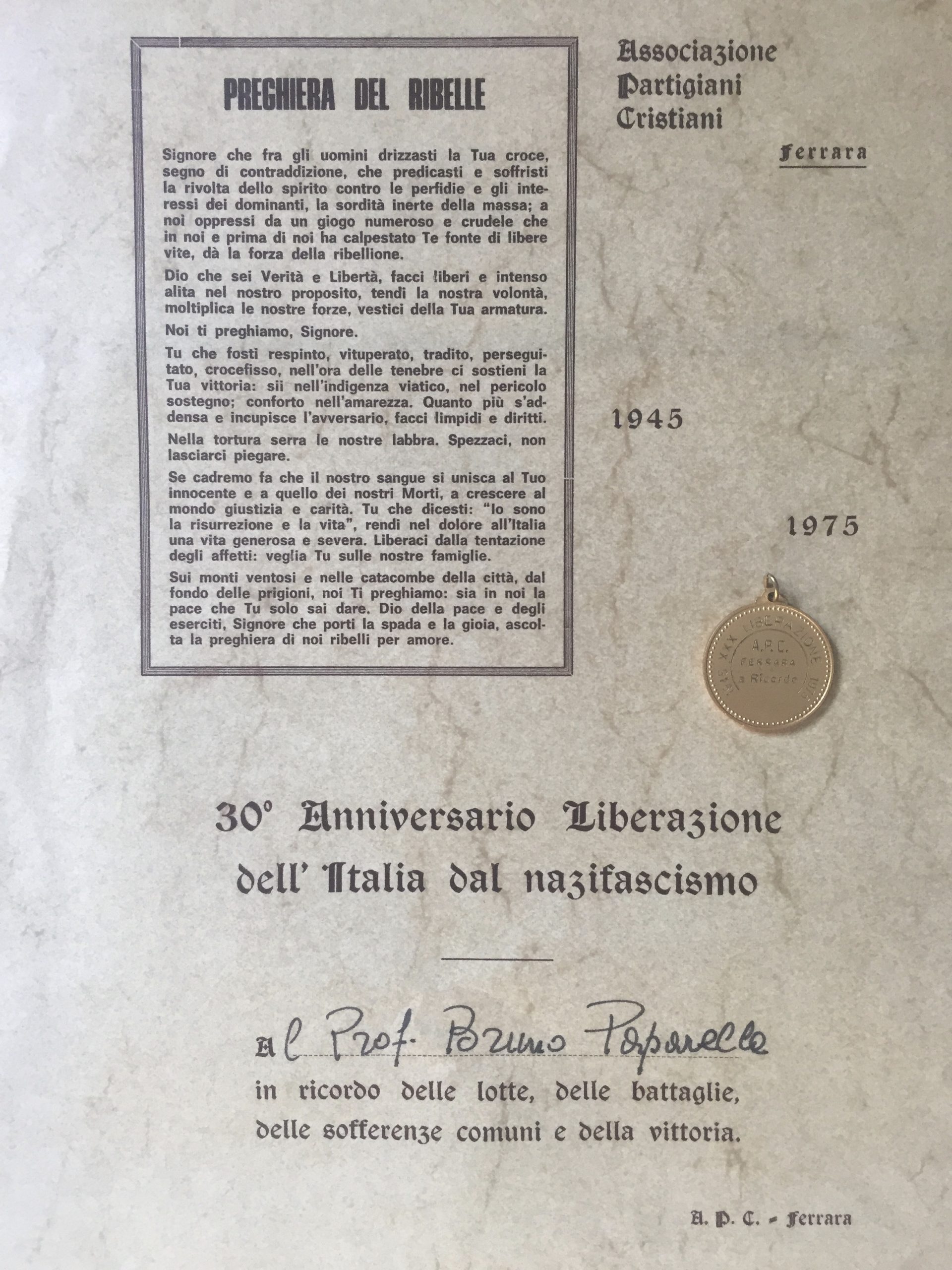Attestato 30° anniversario della Resistenza. Archivio famiglia Paparella
