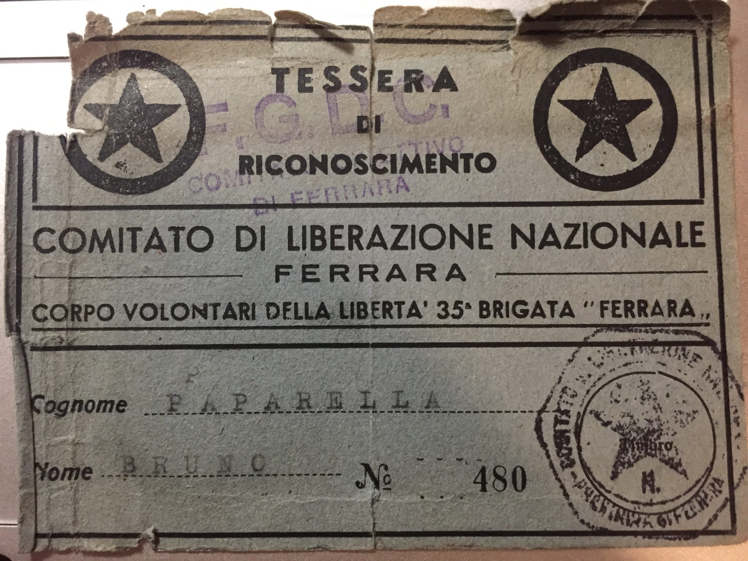 Tessera di riconoscimento di Bruno Paparella del Cln di Ferrara. Archivio famiglia Paparella