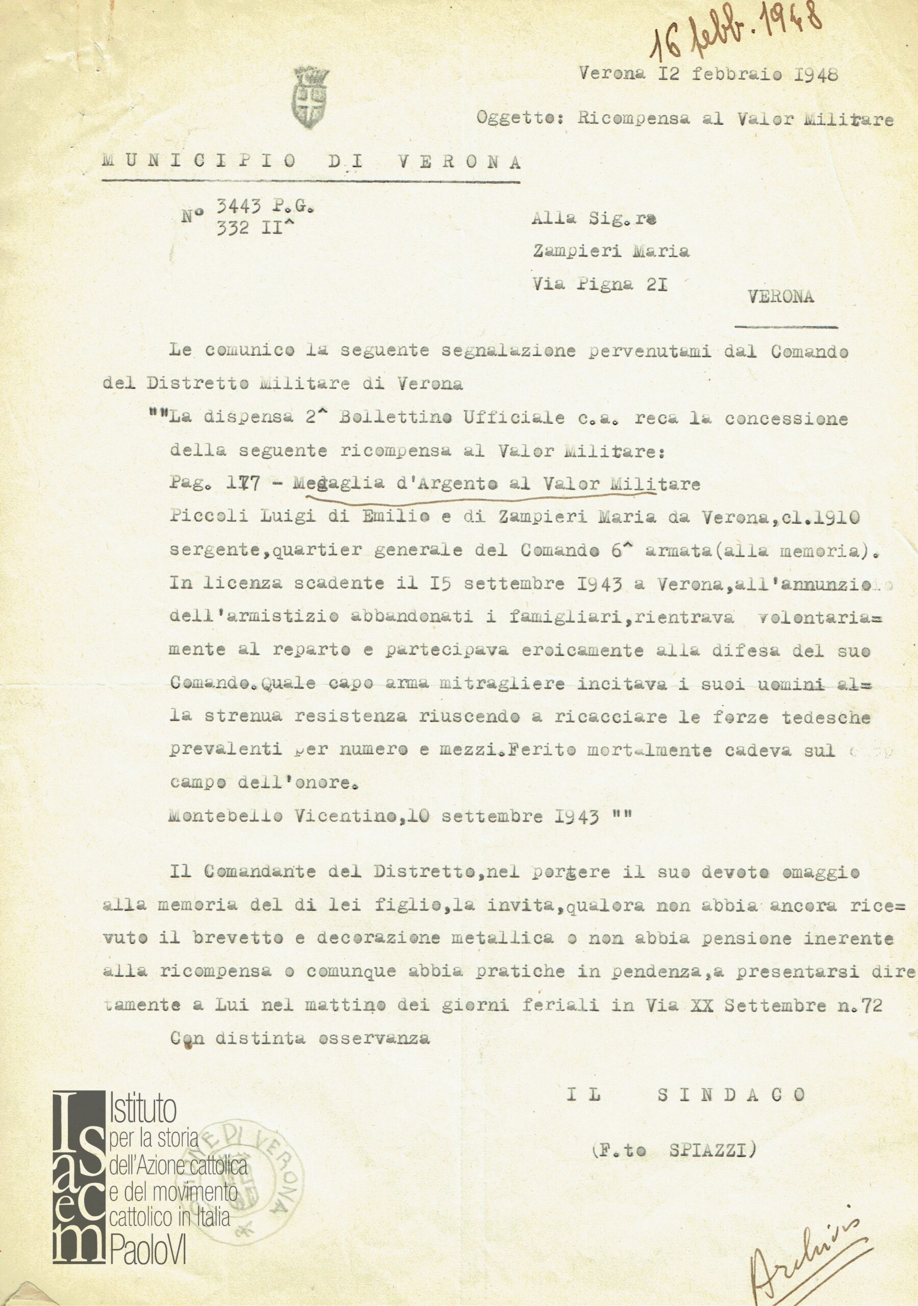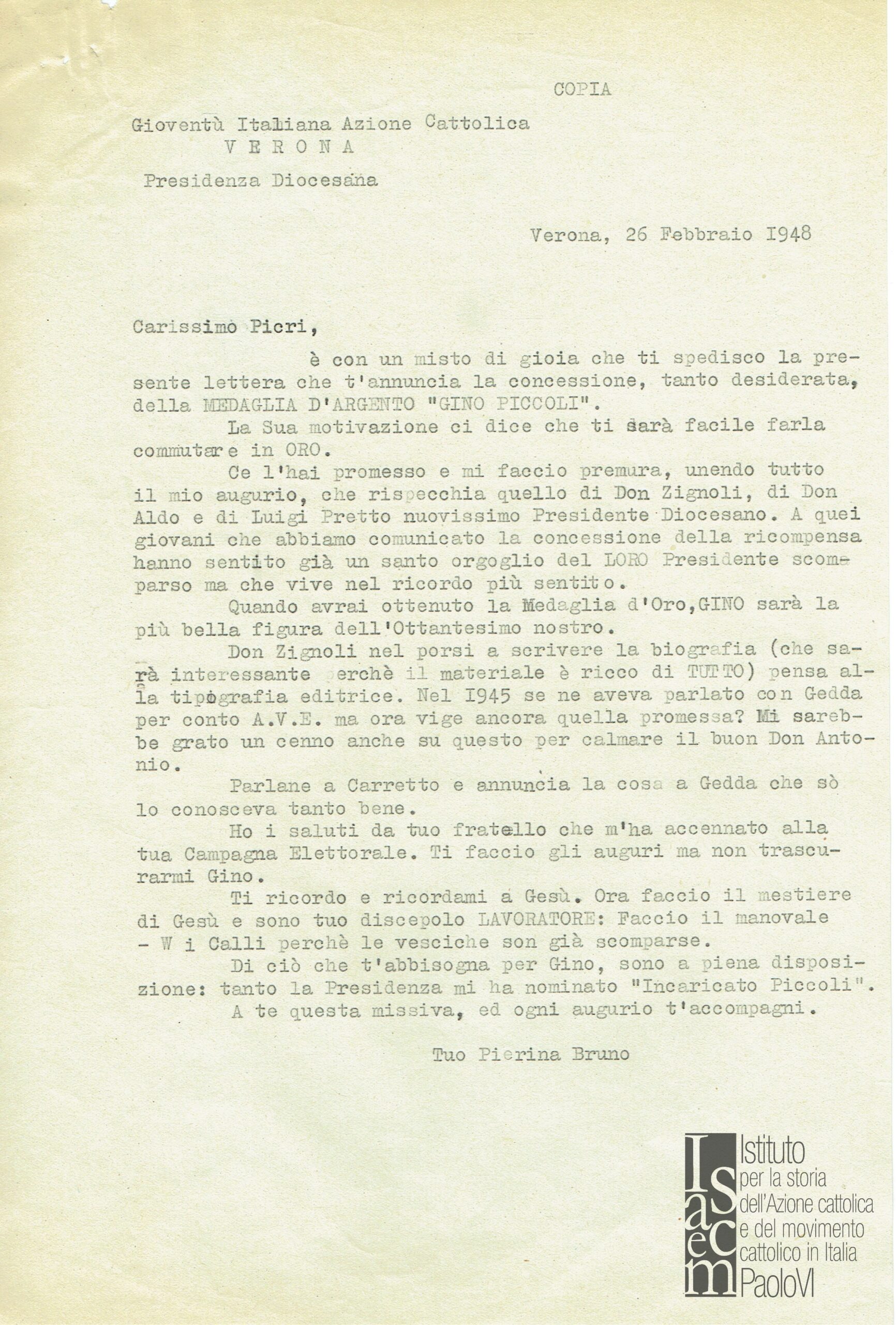 Lettera della presidenza diocesana di Verona. Isacem, Giac, b. 775, fasc. Piacentini-Pizzoni