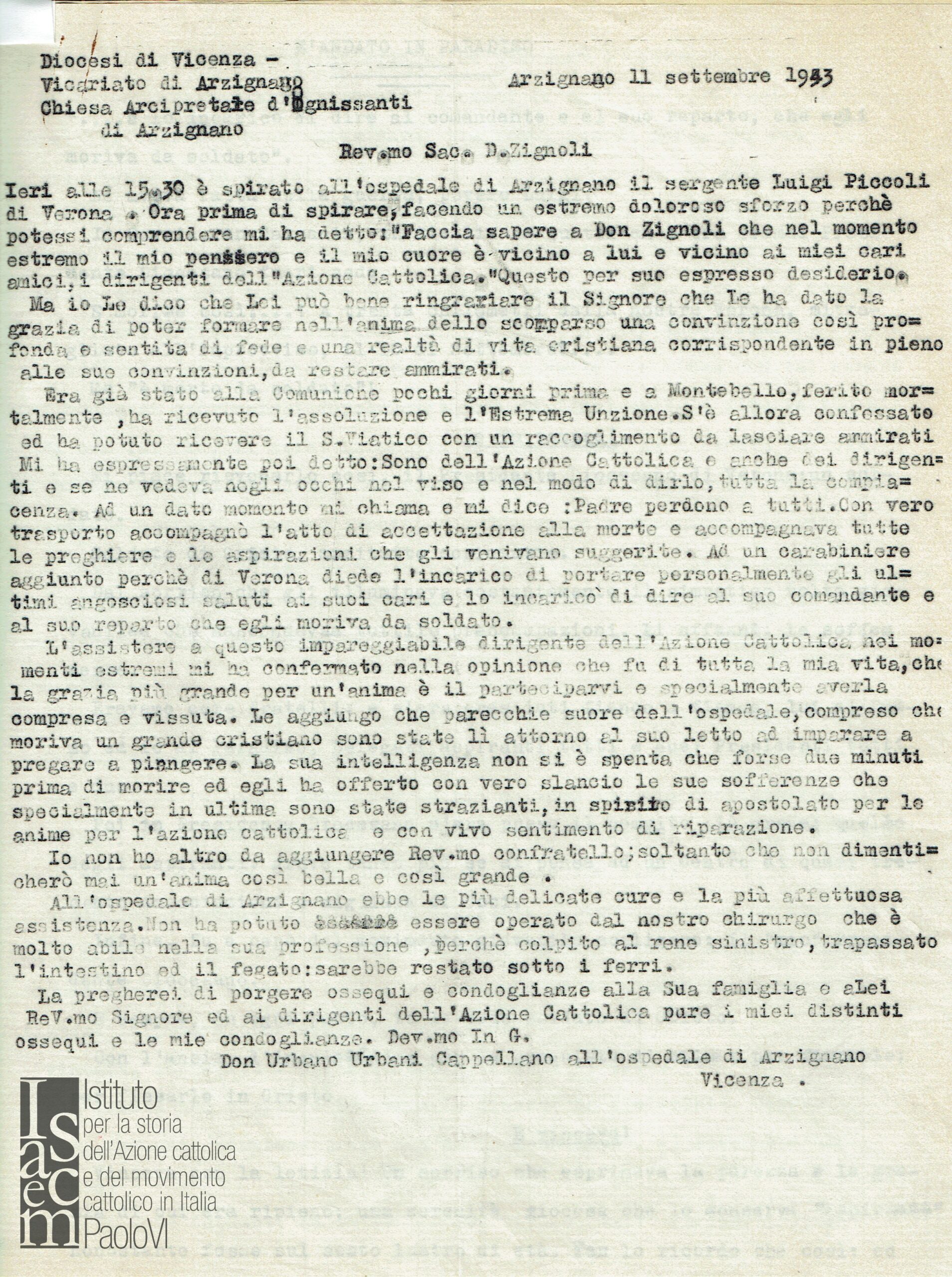 Testimonianza di don Urbano Urbani sulla morte di Luigi Piccoli. Isacem, Giac, b. 775, fasc. Piacentini-Pizzoni