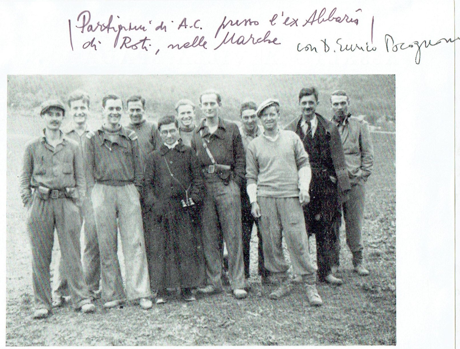 Don Enrico Pocognoni con un gruppo di partigiani di Azione cattolica. Isacem, Giac, b. 770, fasc. 4b