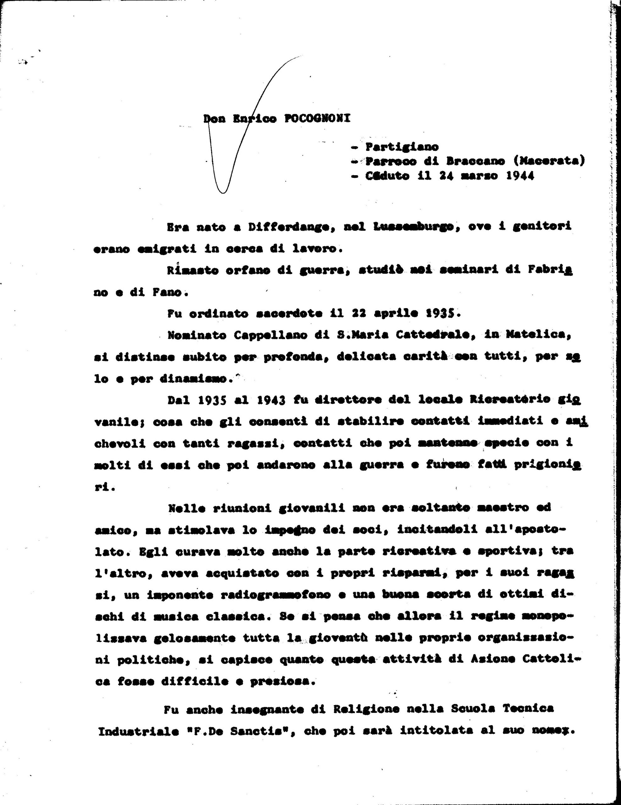 Profilo di Enrico Pocognoni sull'albo di gloria dei caduti di Azione cattolica nella Resistenza. Isacem, Righini, b. 26, fasc. 4b
