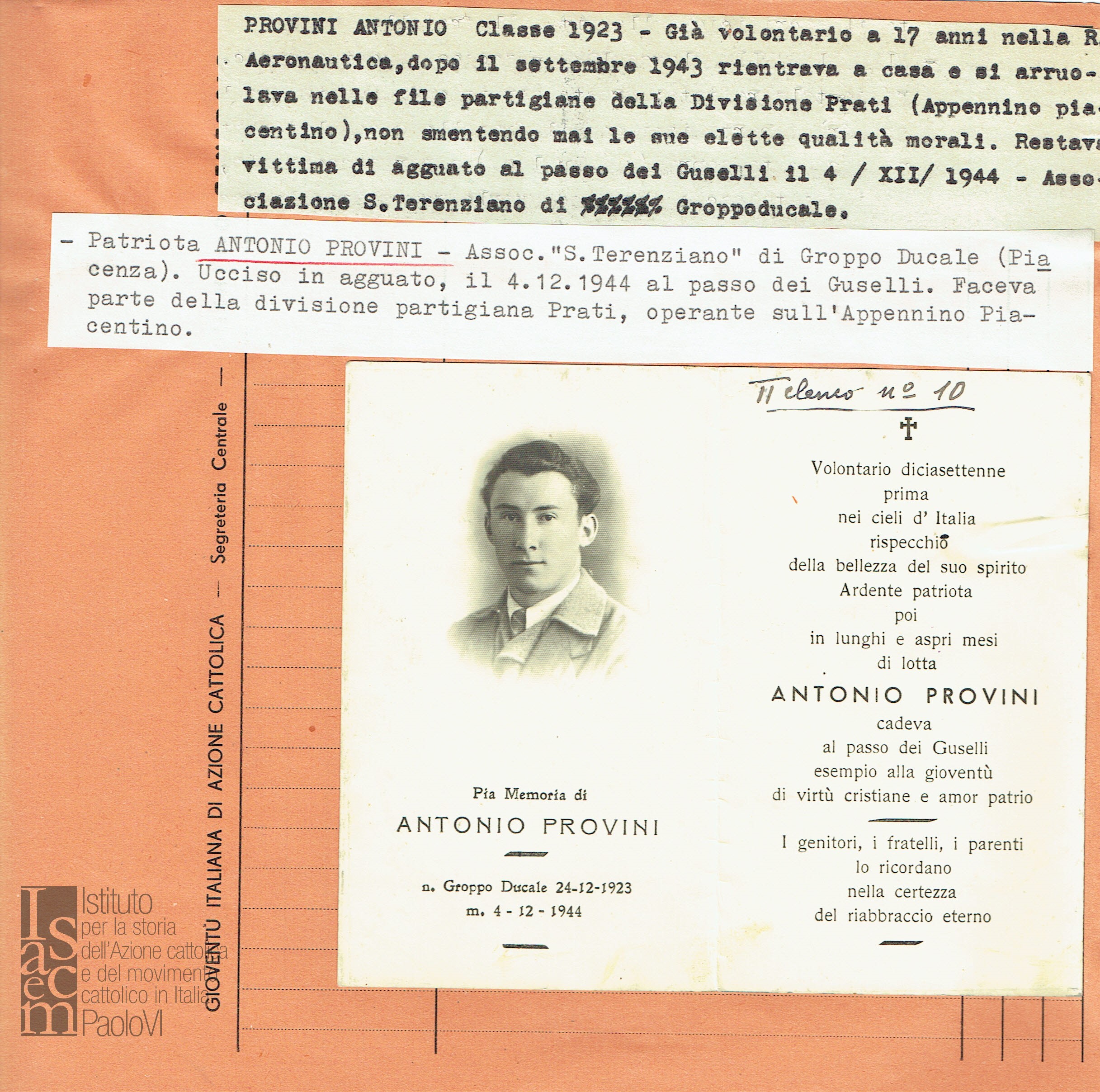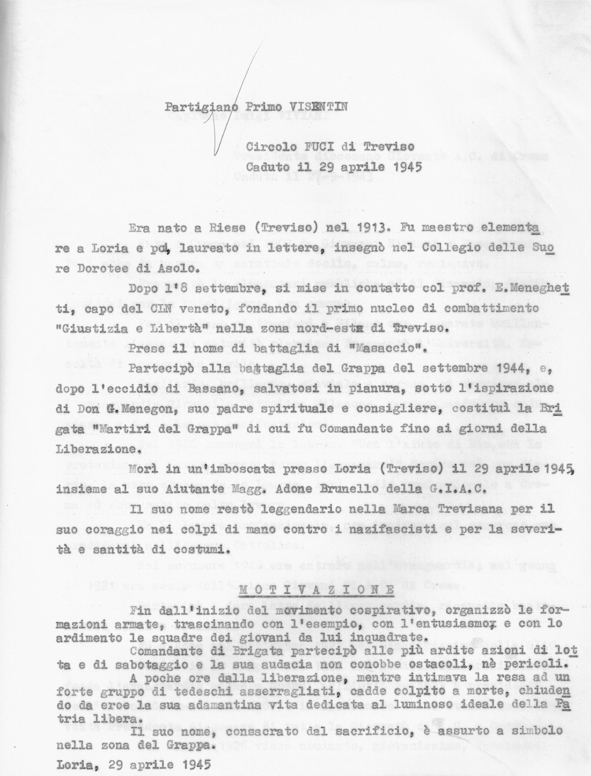Profilo di Primo Visentin sull'albo di gloria dei caduti di Azione cattolica nella Resistenza. Isacem, Righini, b. 26, fasc. 4a