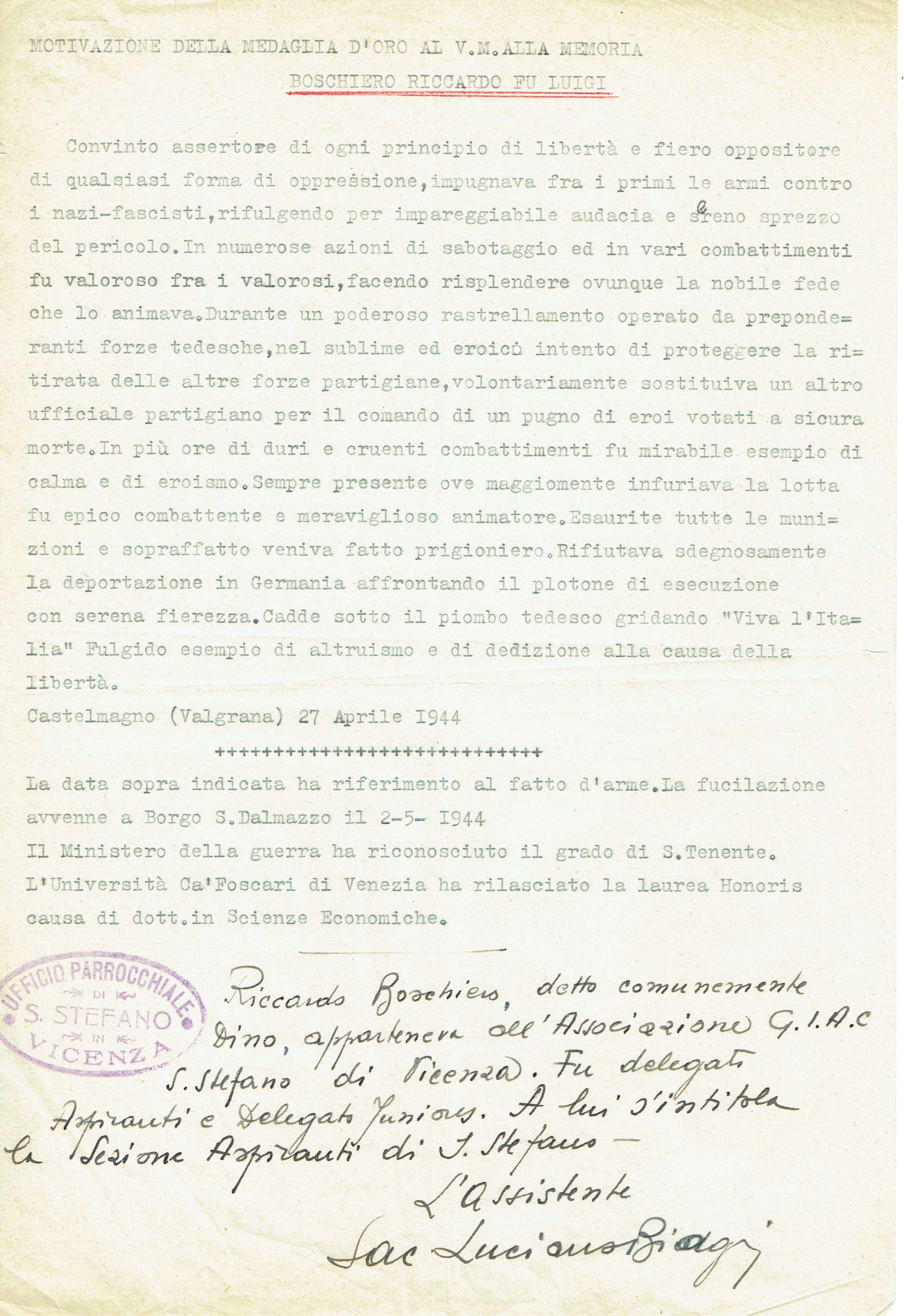 Motivazione della medaglia d'oro al valor militare concessa a Riccardo Boschiero. Isacem, Giac, b. 772, fasc. Bonfanti-Boveri