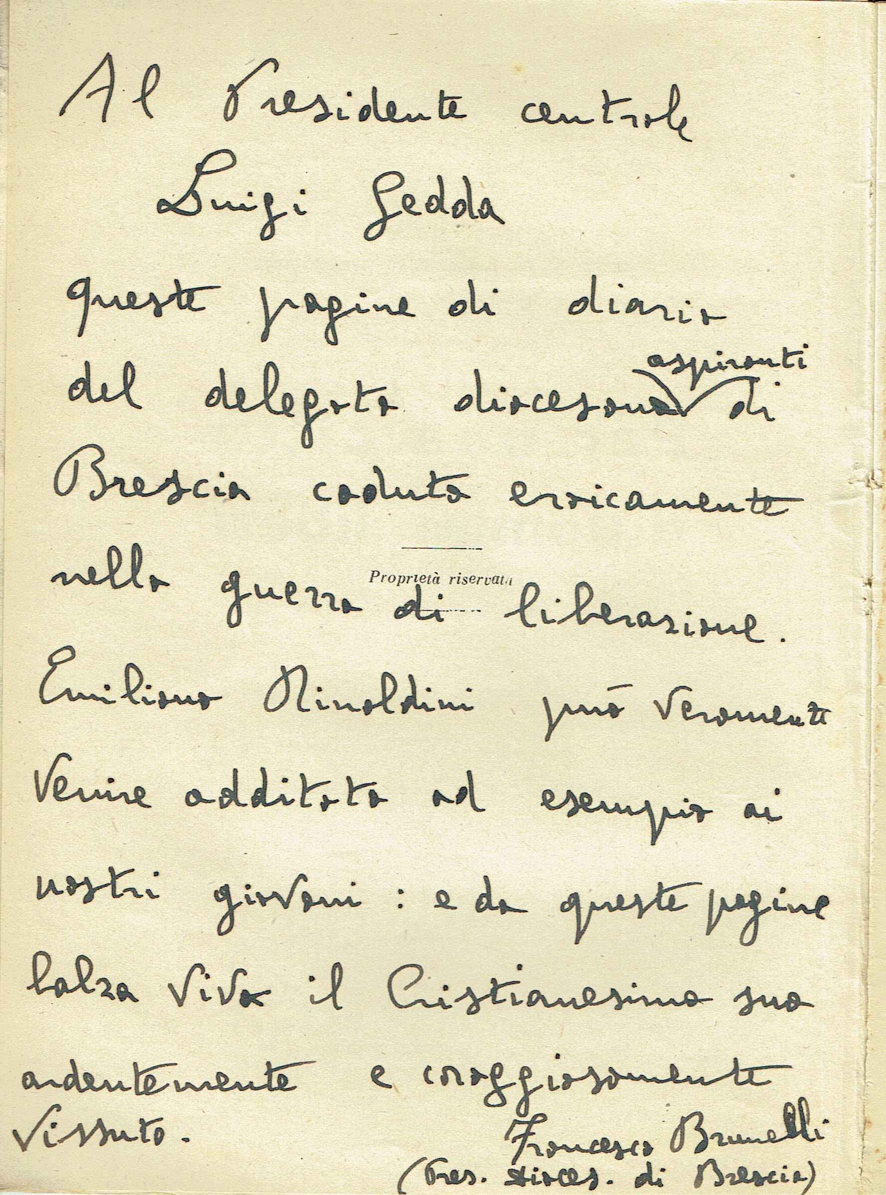 Dedica di Francesco Brunelli a Luigi Gedda sulla prima pagina del Diario di Emiliano Rinaldini. Isacem, Gedda, Aci, b. 1, fasc. "1945 Ac"