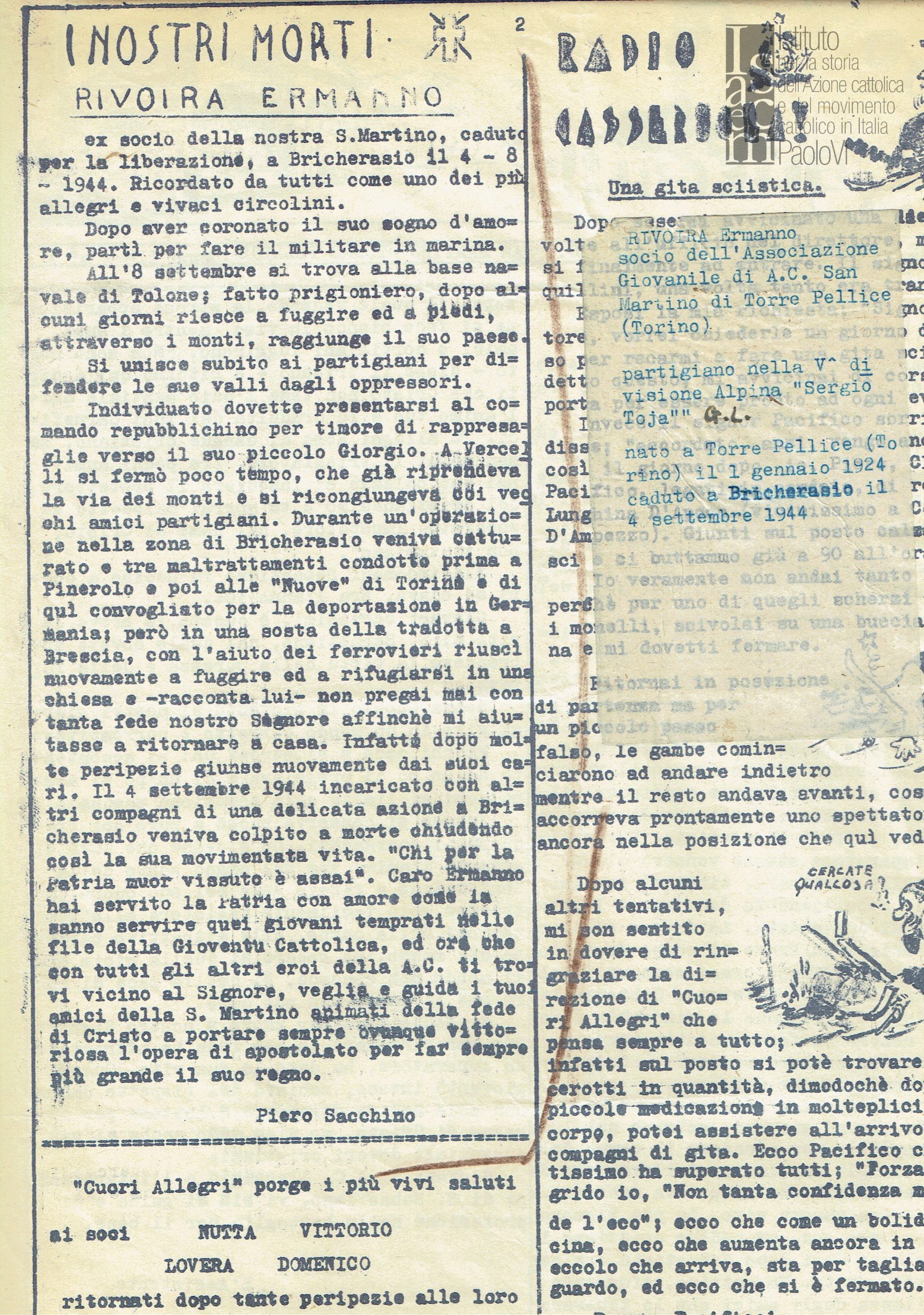 Piero Sacchino, I nostri morti. Rivoira Ermanno, in «Cuori allegri!», 11 (1946), 1, p. 2