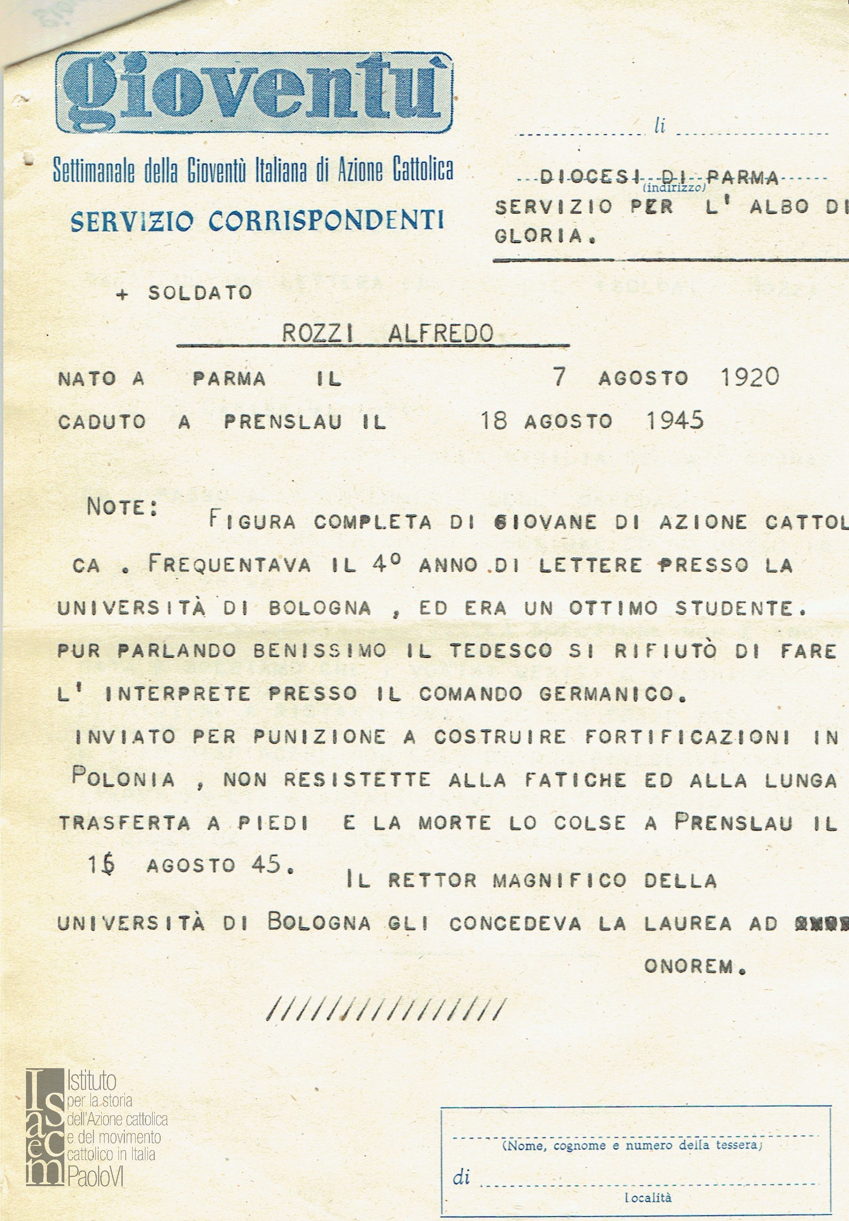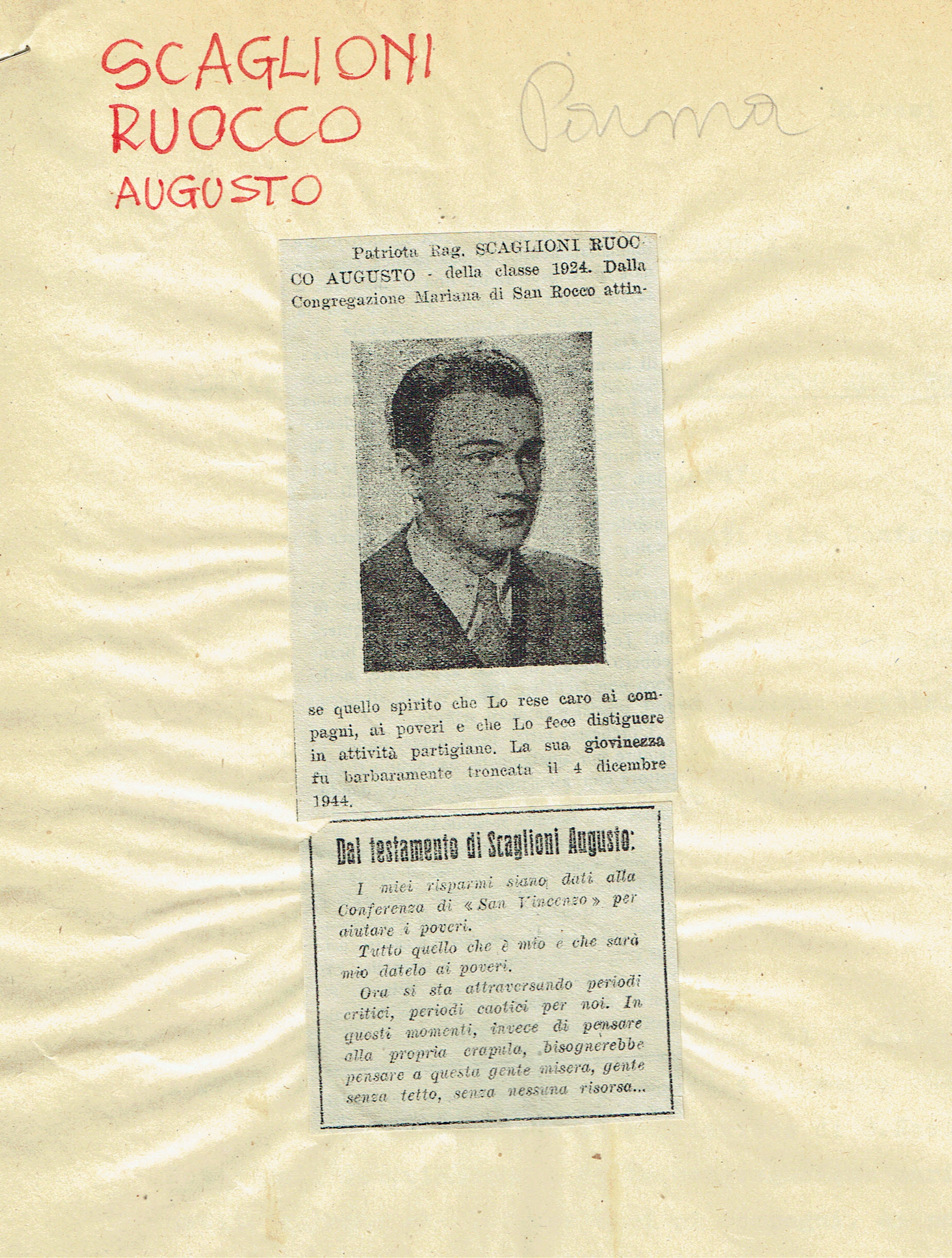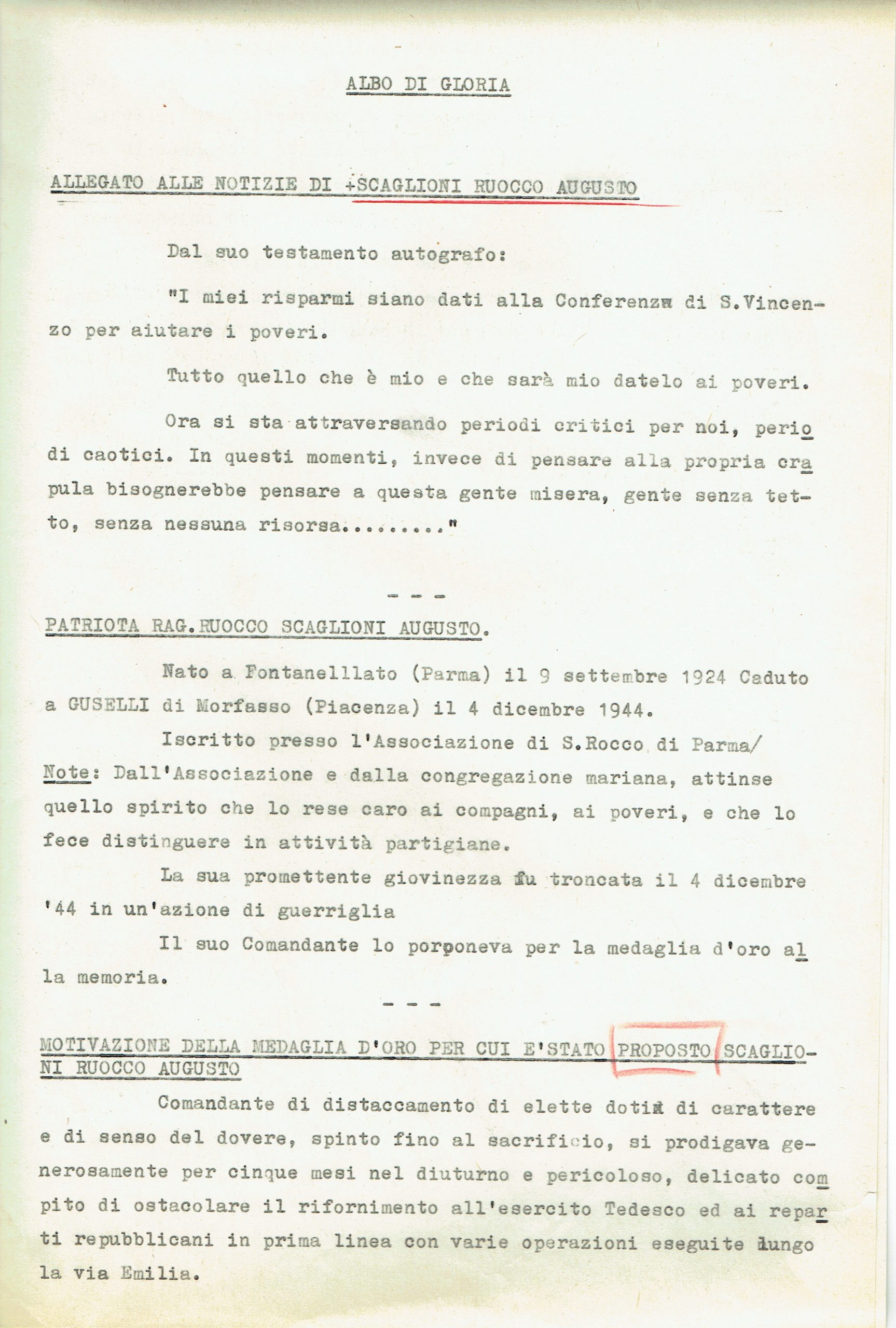Raccolta informazioni su Ruocco Augusto Scaglioni per l'albo di gloria dei caduti dell'Azione cattolica nella Resistenza. Isacem, Giac, b. 776, fasc. Scaccabarozzi-Smiderle