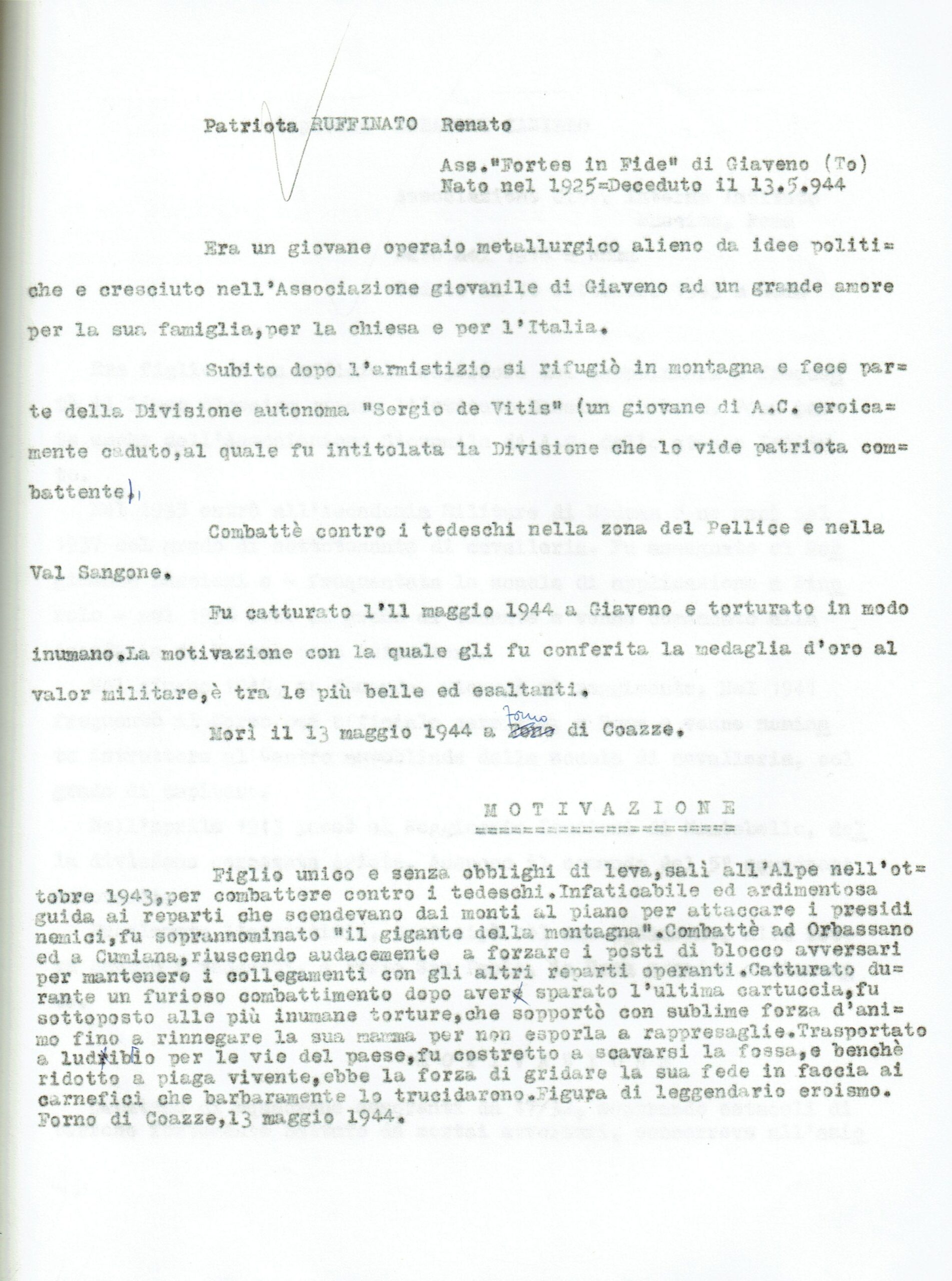 Profilo di Renato Ruffinatti sull'albo di gloria dei caduti di Azione cattolica nella Resistenza. Isacem, Righini, b. 26, fasc. 4a