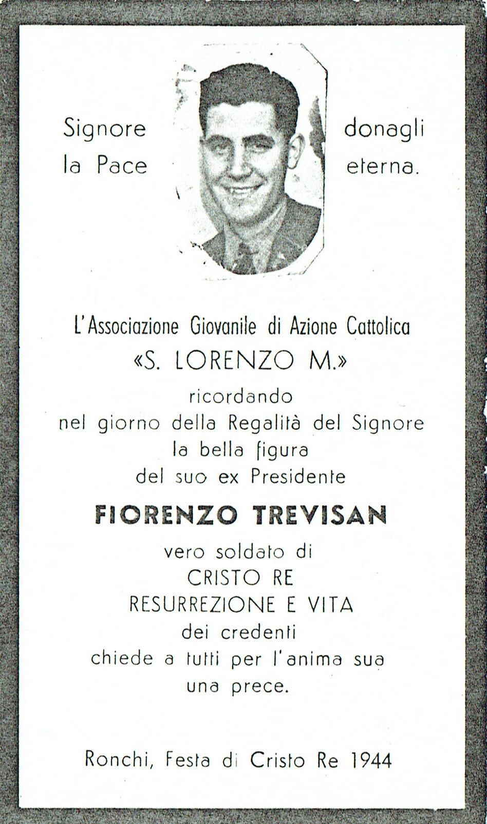 Ricordo funebre di Fiorenzo Trevisan. Documento tratto da: Il diario della memoria. Ronchi 1945-1995, s.l., 1995.