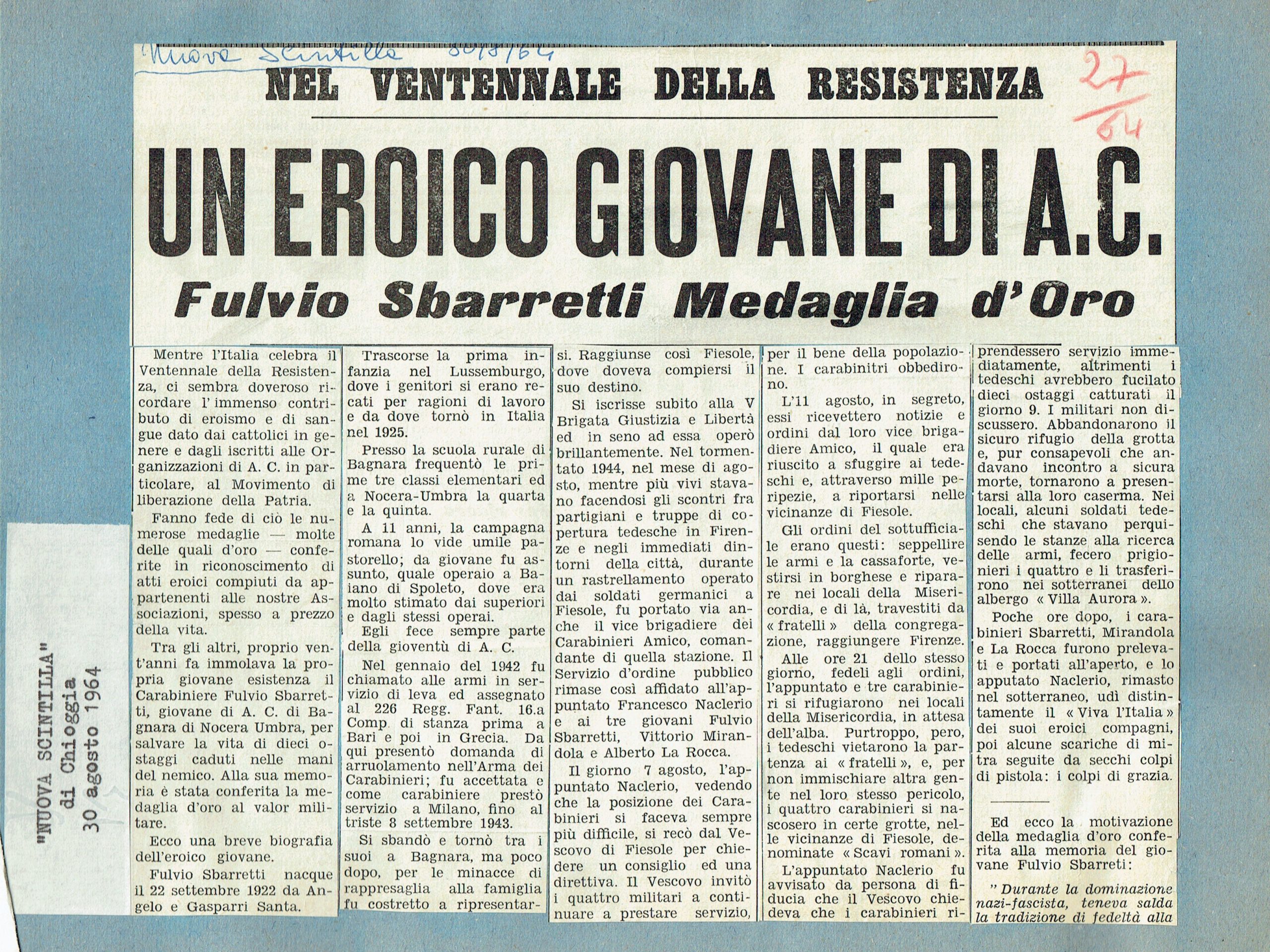 Un eroico giovane di A.C. Fulvio Sbarretti Medaglia d'oro, in "La Nuova scintilla", 30 agosto 1964.